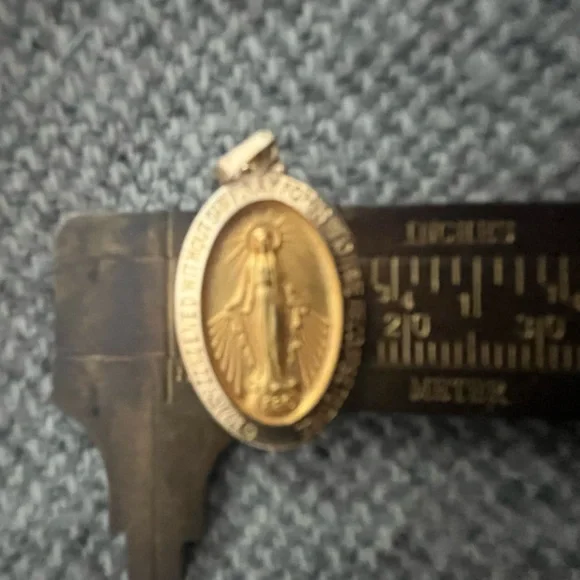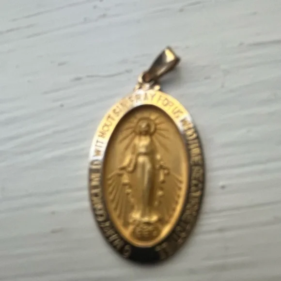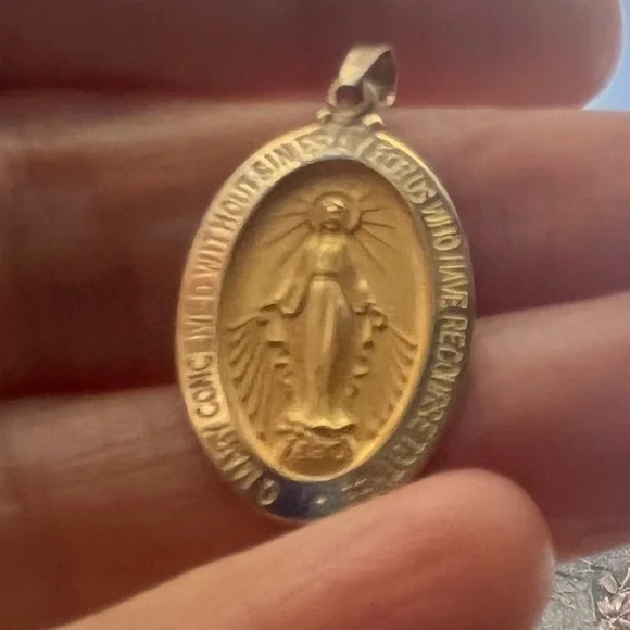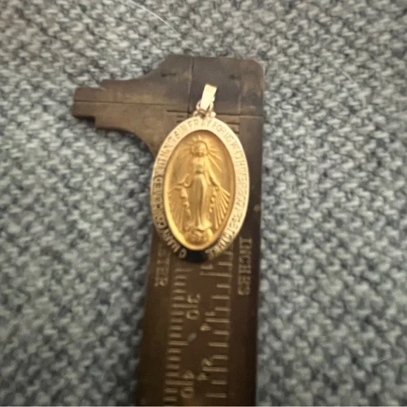 This lovely Miraculous Medal in solid 14k gold is in pristine condition. On the front: a sculptural image of Mary with the inscription: “O Mary conceived without sin pray for us who have recourse to thee”.Sacred heart and Marian symbols at the back., letter M, the cross, and stars around.24 mm (about one inch) long not including the drop. Approximately 15 mm at greatest width.(See photos with my mm ruler.) Stamped 14k gold on the back. Gram weight: 2.93 grams.Lovely as a confirmation or christening gift. Or for anyone who loves Mary and could do with her wonderful help and support. Tags: Christian, Marian, Devotion, prayer, Mother Mary, Catholic, prayers, protection, invocation, faith, faithfulness, hope, joy, heirloom, heirloom quality., keepsake, blessing, blessing , prayer.I’m aAmbassador and top rated seller, so you can buy with confidence. Check my closet for other quality items. Thank you for looking and have a lovely day! ☀️