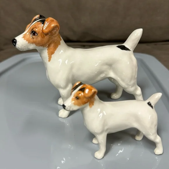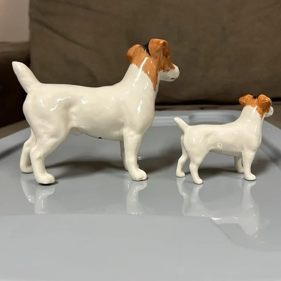 Beswick Jack Russell Terriers Father & Son Porcelain Gloss Model #2023/2109Made in England Bigger is 5” tall 6” longSmaller 3” tall 3.5” longBeautiful figures in excellent condition the small one has a rough spot on his ear(2942425)