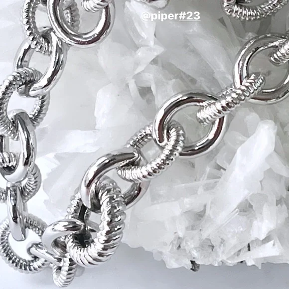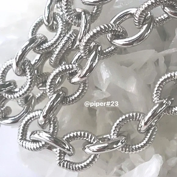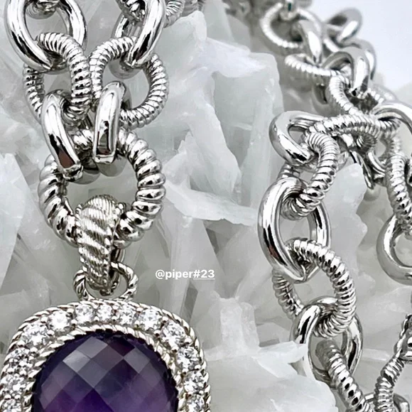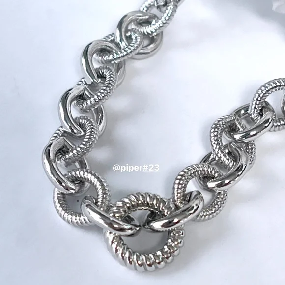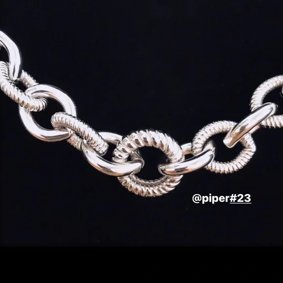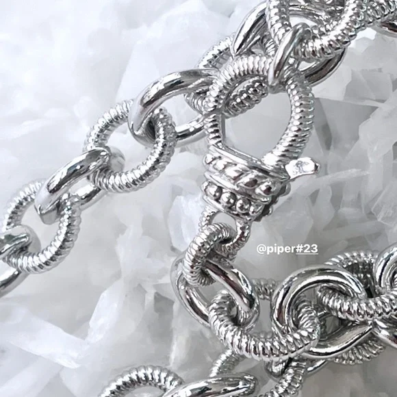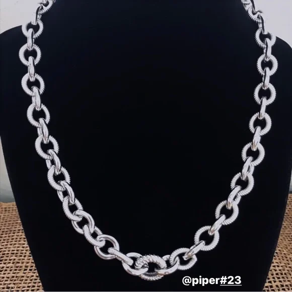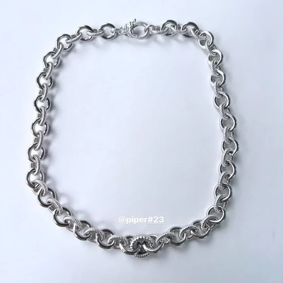 This Judith Ripka Rolo Cable Link Necklace is such a timeless piece!Extremely hard to find in this pristine condition!Rhodium-plated 925 Sterling Silver, with alternating smooth and textured links Center link is larger to accommodate clip on pendant enhancersLarge lobster claw clasp closure Weighty at 93 grams! Necklace measures 18”Cable links measures approx. 11-12 mm eachRetired pieceMade in ThailandNext day shipping** add any available enhancer to bundle and I will discount both pieces!!