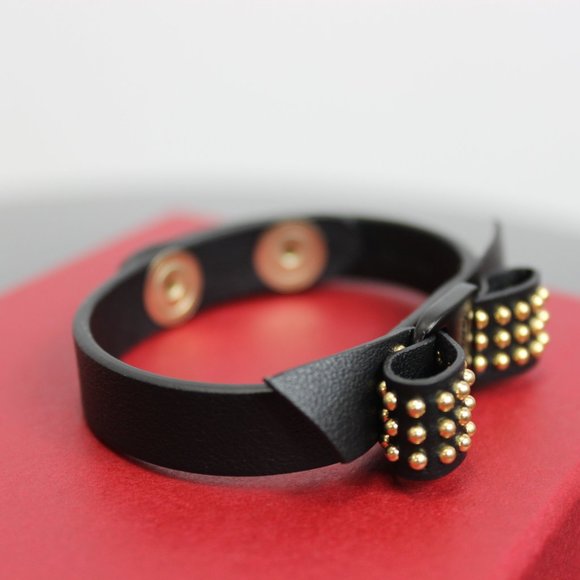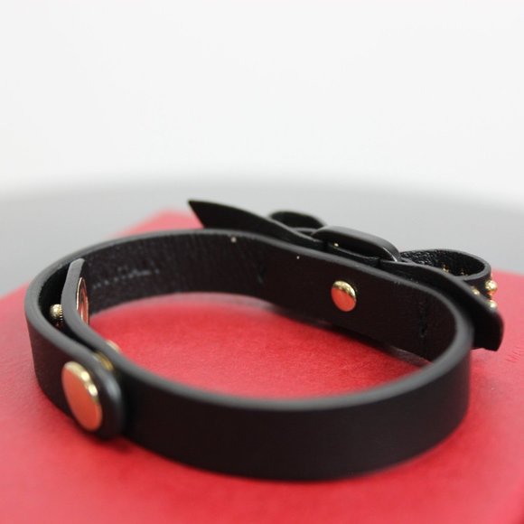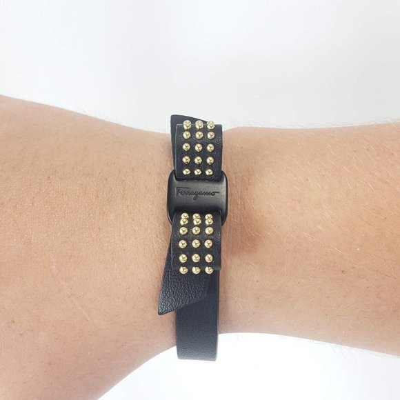 The Salvatore Ferragamo Vara Bow Leather Bracelet in Black can spice up any outfit, and this classic, studded accessory will do just that. Soft leather was elegantly shaped to...