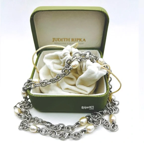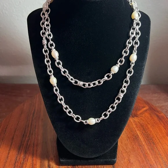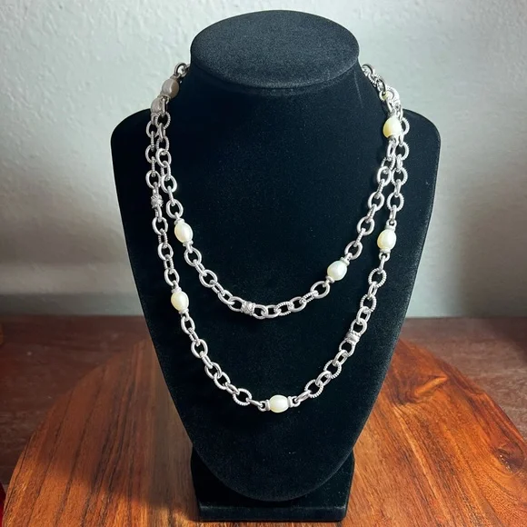 EUC Judith Ripka Cultured Pearl Station Sterling Silver 36” Toggle Necklace