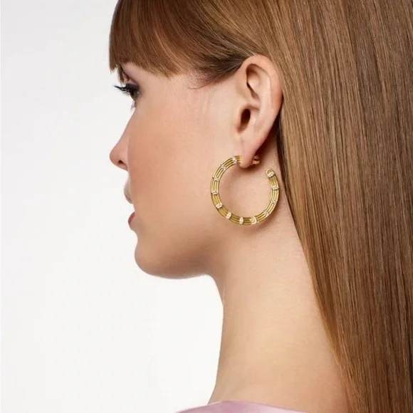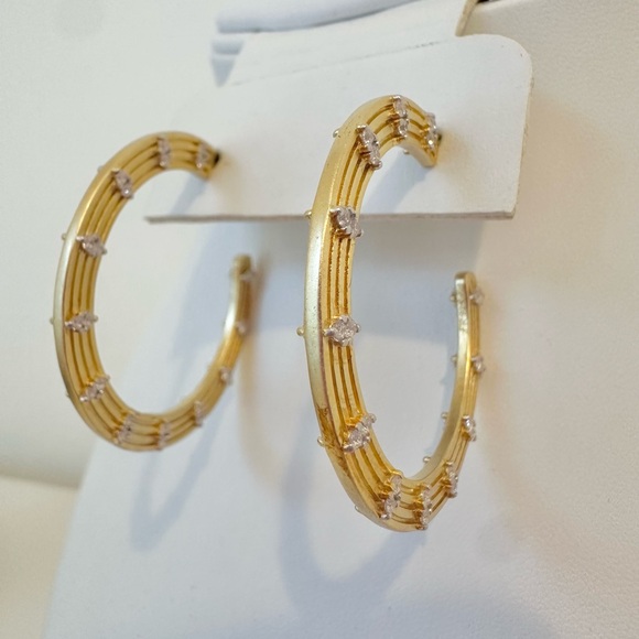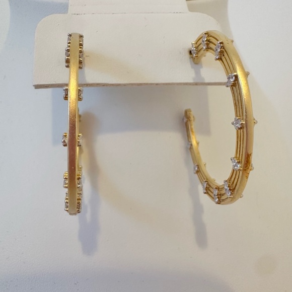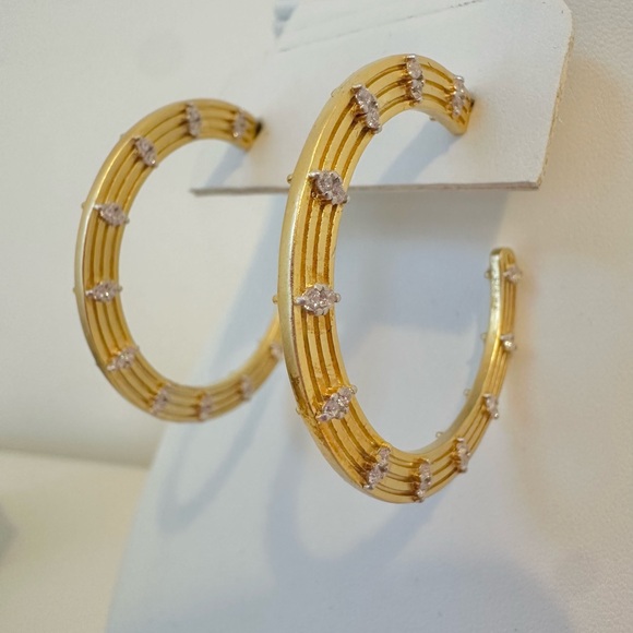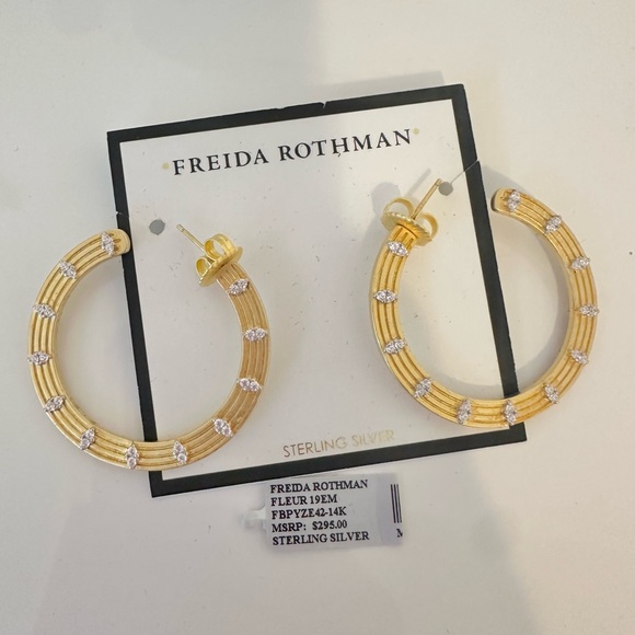 Freida RothmanFleur Bloom Empire Wide Hoop EarringsDESCRIPTIONA statement hoop to make you feel empowered with it´s bold design and sparkling embellishments on both sides. Inspired by New York and the "Empire State", the Fleur Bloom Empire Wide Hoop Earrings have modern art deco flair. Luminous matte gold features marquise pave stone for an iconic style that will dress your ears day or night.Measures: 1.5"14KT Gold Plated Sterling SilverHand-set Cubic Zirconia StonesBrand new, never worn.Comes with a box.Original Price $295