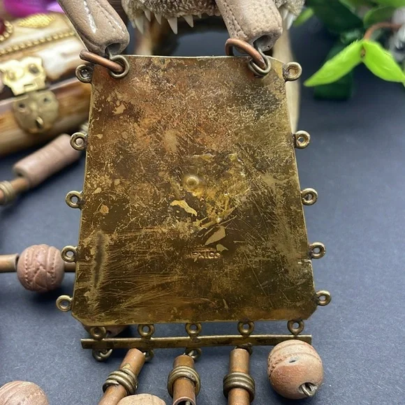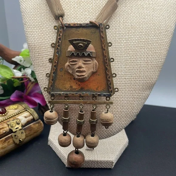 Unique clay Casa Mayan vintage necklace on a brass setting.Pendant is 5 inches long and necklace chain is 26 inches end to end.