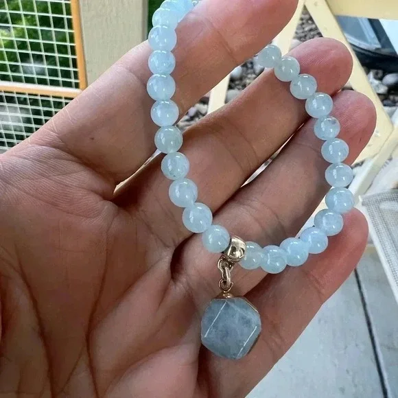 Aquamarine beaded gemstone stretch bracelet. Beautiful Sky Blue natural color. No dye. Perfect choice for women and men. 6mm perfectly round Aquamarines14mm free form cut charm