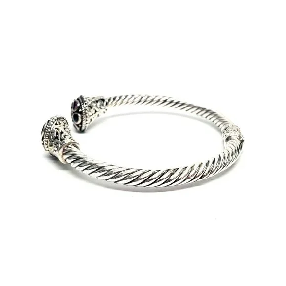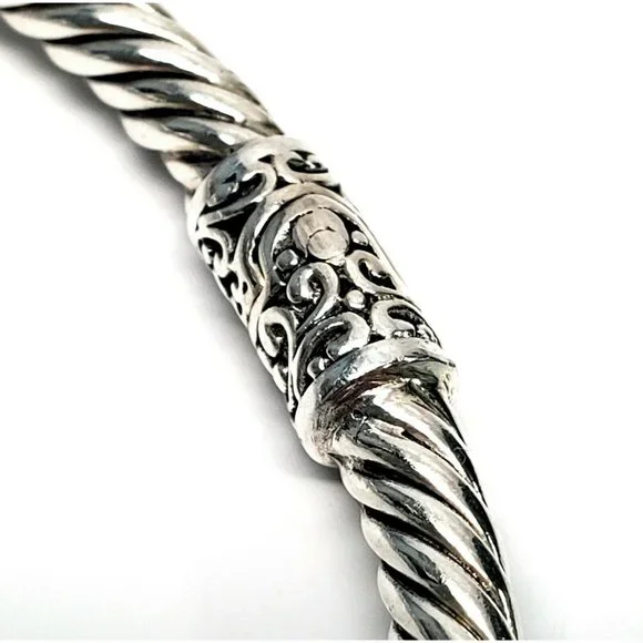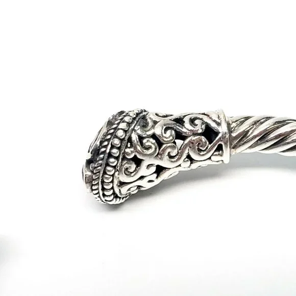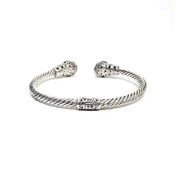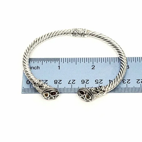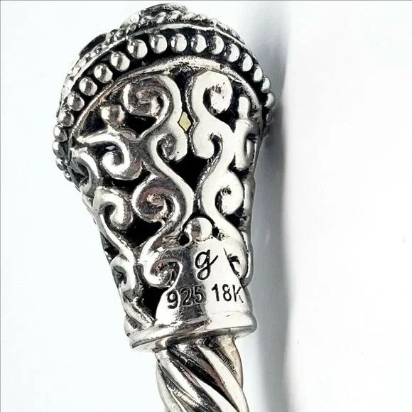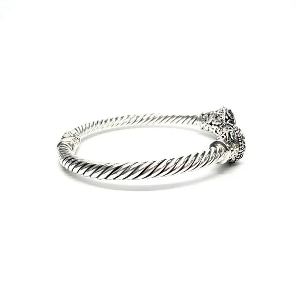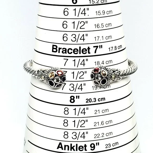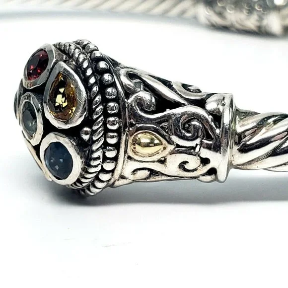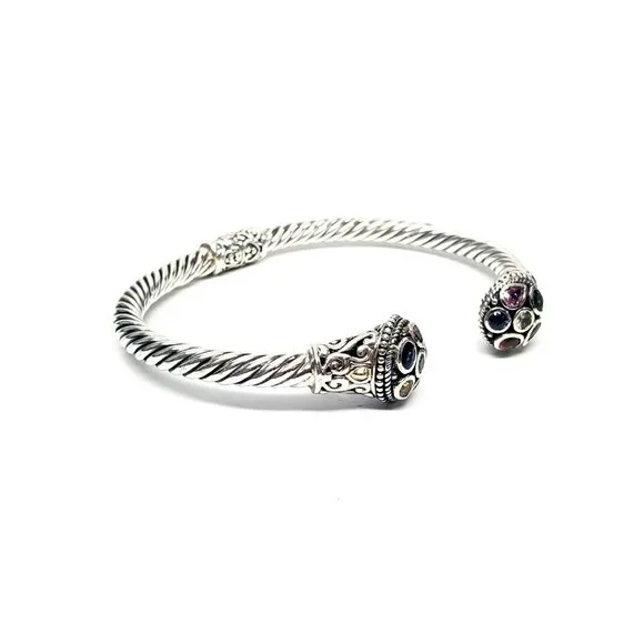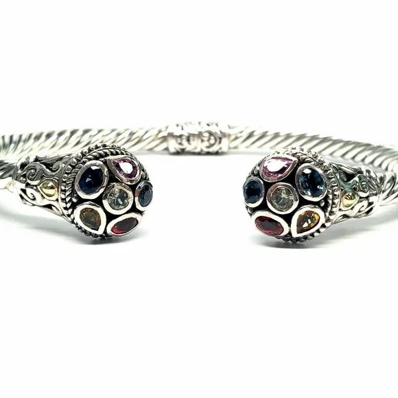 Samuel B sterling silver hinged cuff bracelet with 18K yellow gold accents. Features multi-colored gemstones on the end caps surrounding by beaded accents and scroll designs on a rope cuff.Measures approx. 7" inside end to end with 1/2" gap. 5mm wide.Weighs approx 14.4dwt, 22.4gMarking: g 925 18KExcellent pre-owned condition.Item will be packaged securely and shipped priority mail with insurance.