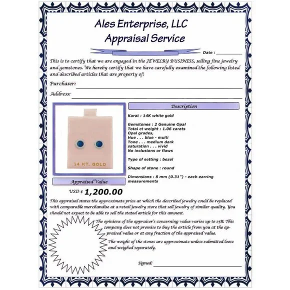 Main Stone Color: Blue - multiMetal: White GoldMain Stone Shape: RoundMaterial: GemstoneMain Stone: OpalFastening: Push backs (pierced)Main Stone Creation: NaturalTotal Carat Weight: 1.06 caratsStyle: StudMetal Purity: 14k