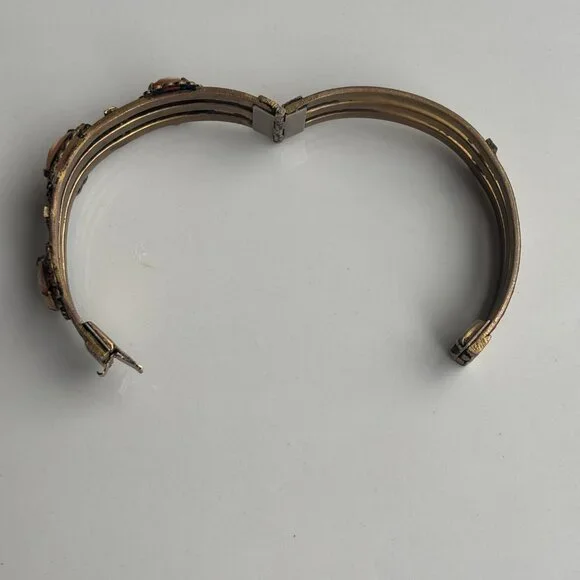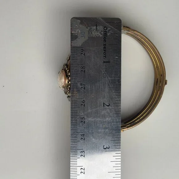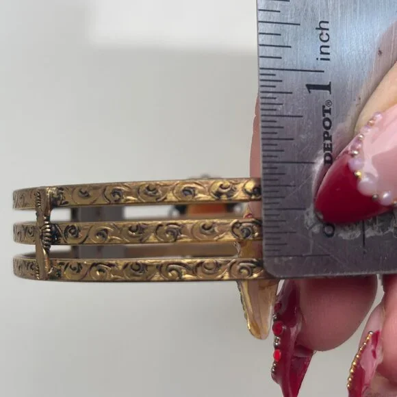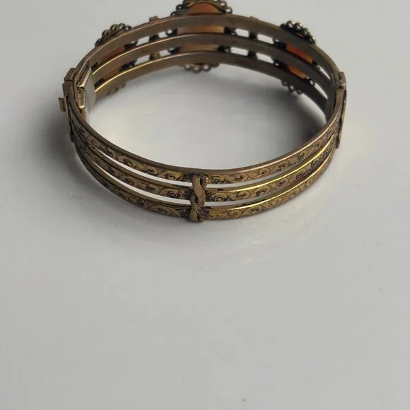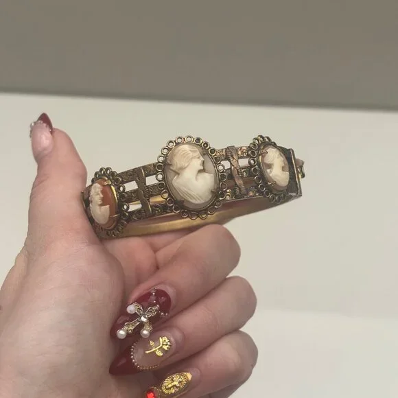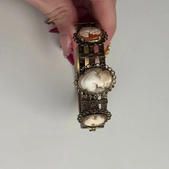 Vintage Gold-Tone Cameo Hinge Bangle Bracelet, Victorian StyleIn great condition. Slight signs of wear. No damage. Vintage jewelry. Some slight scuffing and tarnishing. This item is used, preloved condition. Comes as is. Measurements are in listing pictures.Gold-tone hinged bangle bracelet, featuring three carved cameo portraits. Each cameo showcases a profile of a woman. The cameos are framed in ornate settings.* Material: Gold-tone metal (composition unknown)* Finish: Aged patina with vintage tarnishing throughout.* Closure: Secure hinge clasp that locks into place and opens smoothly* Weight: Medium-weight* Three detailed cameos set in decorative frames* Intricate scrollwork pattern along the band for added elegance* Central cameo has been carefully resecured with B7000 jewelry glue—firmly attached and stableDisclaimer: The exact metal composition is unverified. This item is sold as-is.