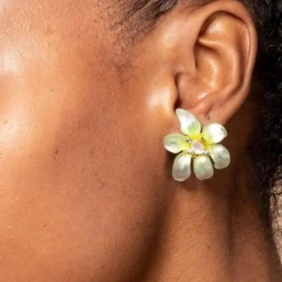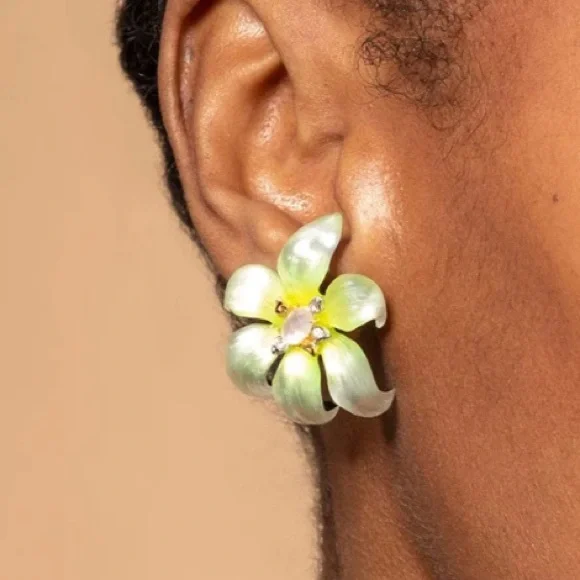 Hand-sculpted and intricately detailed, these luminous lily flower stud earrings are hand-carved and hand-painted in a glowing iridescent ombre effect of sunkissed iridescent white. Accented with mother of pearl doublets and crystal centers.Details:* Lucite, 14k gold plated brass* Surgical steel ear posts, clear disc earring back* Mother of pearl doublet & crystal* Weight: 3g, lightweight* UPC: 889519122317* Measurements: 1.5" length x 1" width* Care: To clean these iridescent white ombre Lucite flower post earrings, gently wipe the surface with a soft cloth.