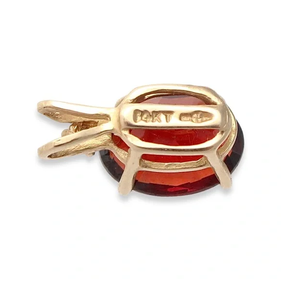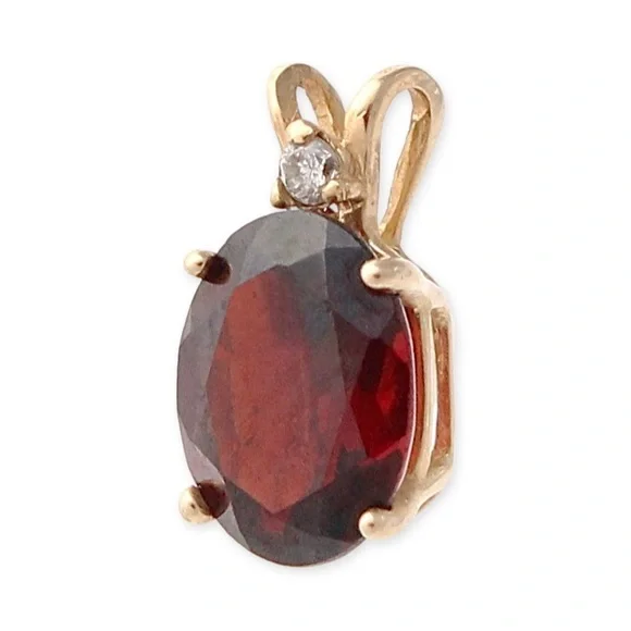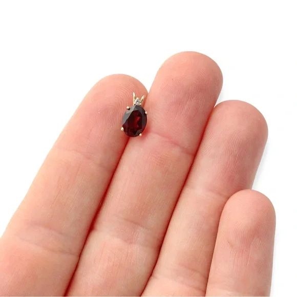 Vintage 14K gold garnet and white sapphire necklace pendant. Acquired from a private estate collection, this two-stone pendant features an oval cut garnet gemstone with a deep red color and a round cut white sapphire. Stamped 14 KT with hallmark on back. This would look stunning on a delicate necklace chain. 0.4” length and 0.2” width. Excellent pre-owned condition.