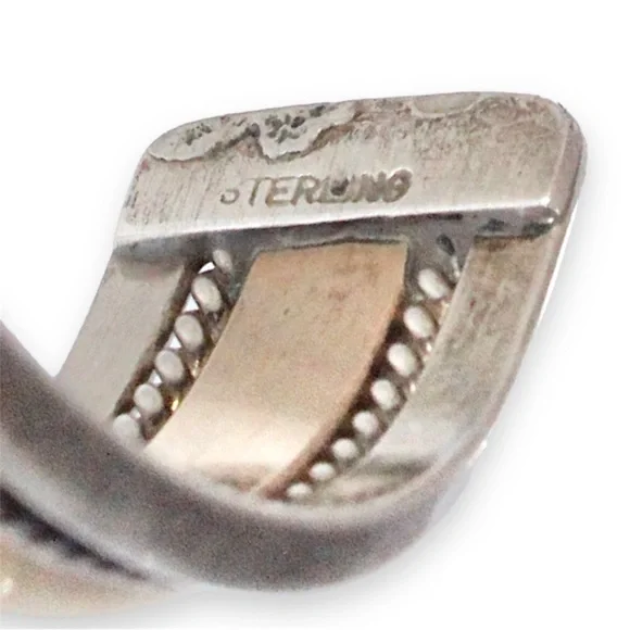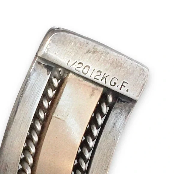 Vintage sterling silver and 12K gold filled cuff bracelet. Acquired from a private estate collection, this two-tone mixed metal Southwestern cuff is Navajo / Native American made. It is hand-crafted from heavy gauge solid sterling silver and gold fill. Twisted rope / cable detail. Stamped “Sterling” and “1/20 12K G.F.” for fineness. This unisex cuff has a solid weighty feel at an impressive 30 grams. 2.45” interior diameter and 0.5” width. Excellent pre-owned condition.