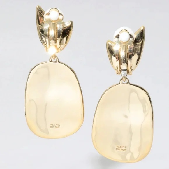 Abstract shapes add a bold touch to your look. Grey pearl, synthetic coral, quartz and lemon Chrysoprase make a perfect bouquet of color on these clip-on earrings.Details:* 10k gold tone plated brass, grey pearl, synthetic coral, quartz and lemon chrysoprase* UPC: 889519070229* Measurements: 2" length x 1" width* Care: To clean, gently wipe the surface with a soft cloth