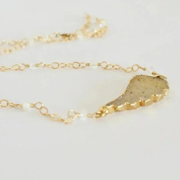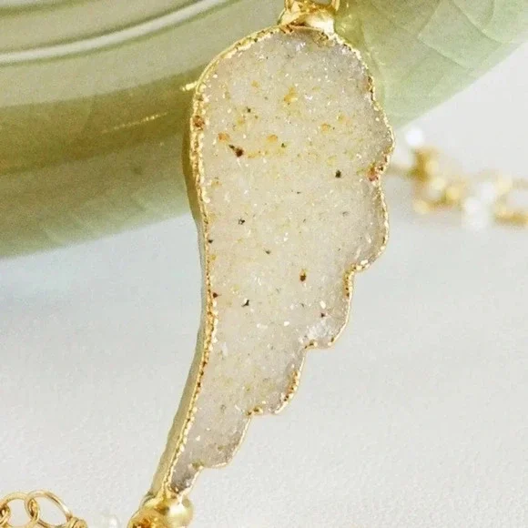 We custom make pieces, too.Just ask!Last One in the Crystal Quartz.This Luxe quartz Drusy feather is just beautiful. A perfect Crystal quartz for anytime of the year.This drusy is translucent so the light goes through drusy. The sparkle you will see is from the different layers of crystal formations.You will see specks of Citrine in this Crystal Quartz drusyI have added faceted Crystal quartz gemstones that have been wire wrapped with 14kt gold filled wire and ended with a spring clasp.The outline of this beautiful drusy has been painted with a copper based paint on the surface and then electroformed with 24kt gold.The finished length is 16 inches. With a 2 inch extender.The length of the drusy pendant is about 1 3/4 inches.The Crystal quartz gemstones are 3mmDefinitely a heirloom piece.dog, flower, vacation, baby shower, photography, party, holiday, wedding, birthday, anniversary, proposal, sweet 16, watches, rings, earrings, necklaces, bracelets, brooches, collectibles, classy, bridesmaid, bride´s mom, fiance, wife, girlfriend, bride, mother, father, gift, present, engagement, distressed, art, moon, puppy, cat, christmas, summer, spring, fall, winter, jeans, chic, fashion, trendy, vintage, grunge, retro, boho, tiki, rare, beach, ocean, travel, basic, minimalist, loose, vacation, festival, coachella, clothing, sexy, cute, adorable, soft, cozy, warm, cool, baby shower, casual, cropped, high rise, unisex, dainty, handbag, purse, activewear, heaven