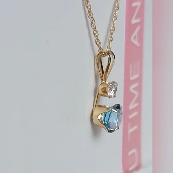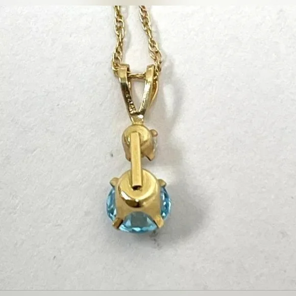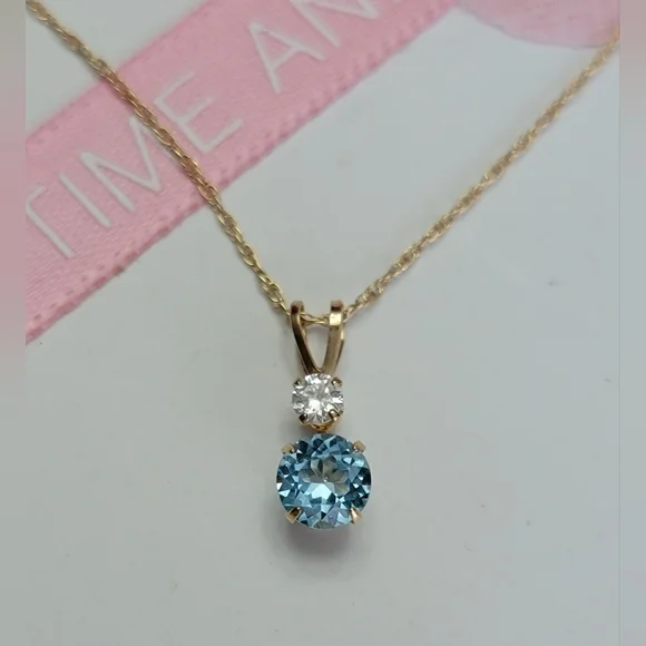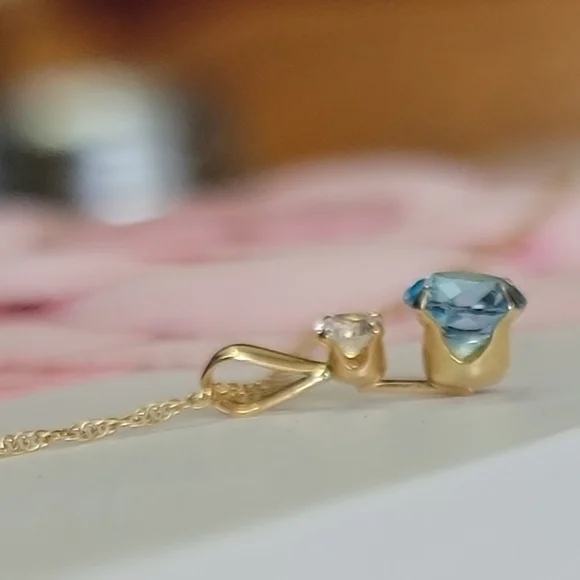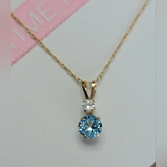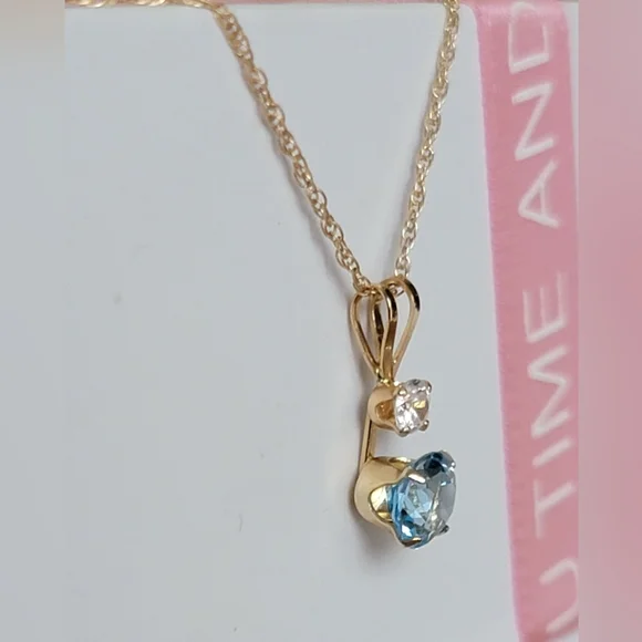 14K Solid Yellow Gold Blue Topaz w/ CZ Accent Necklace