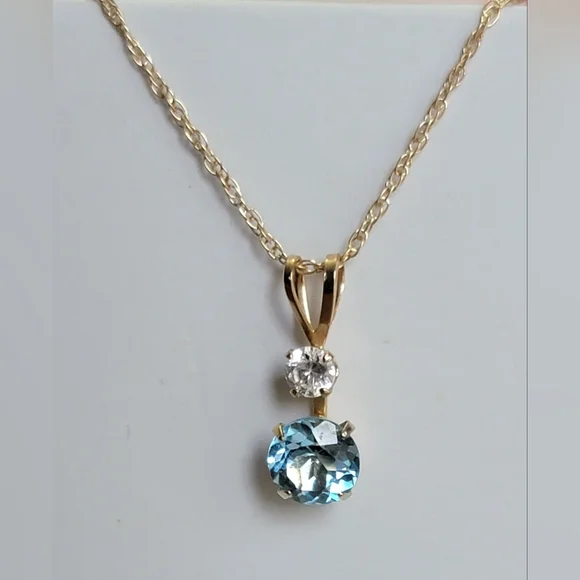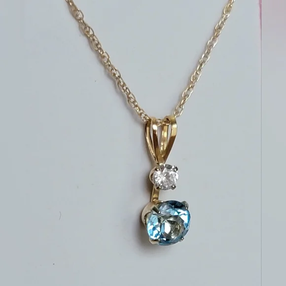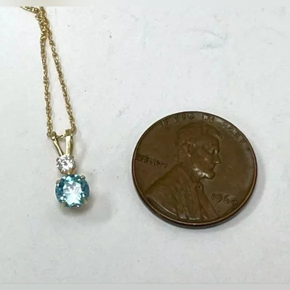 18" 14K Yellow Gold Blue Topaz Pendant Necklace w/ Cubic Zirconia Accent, 0.9gKey Features: 14k yellow gold chain and pendant, pendant is two round stones, 1 white cubic zirconia, and 1 larger round blue topaz Total Weight: 0.9 gramsStone: blue topaz, cubic zirconia Stone Measurements:topaz - 5.0mm, cz - 2.8mm Overall Measurements: 1/2" x 3/16" pendant Size: 18" chain Markings: 14K, acid tested