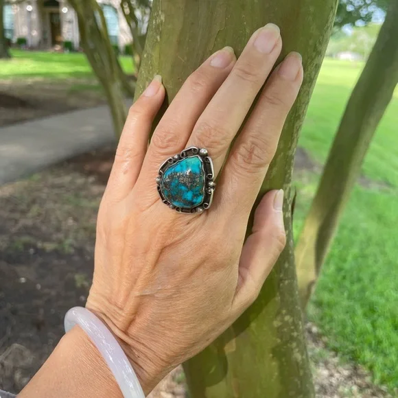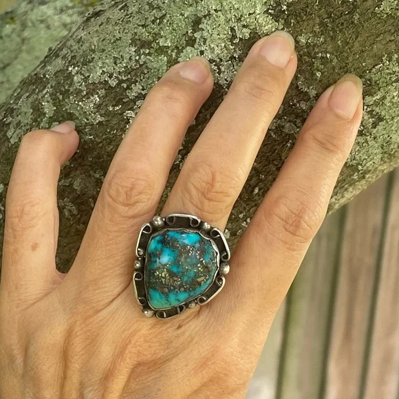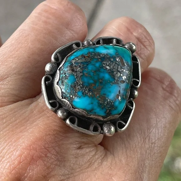 Stunning Antique NATURAL Old Mined Pyrite Matrix Golden/Black Flake Blue Turquoise crafted in an intricate Sterling Silver Southwestern Style.Size 5.50.A Beautiful Bold Statement Ring!!!Rare Find ⭐️In very good condition.