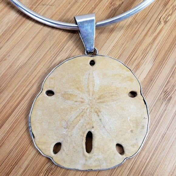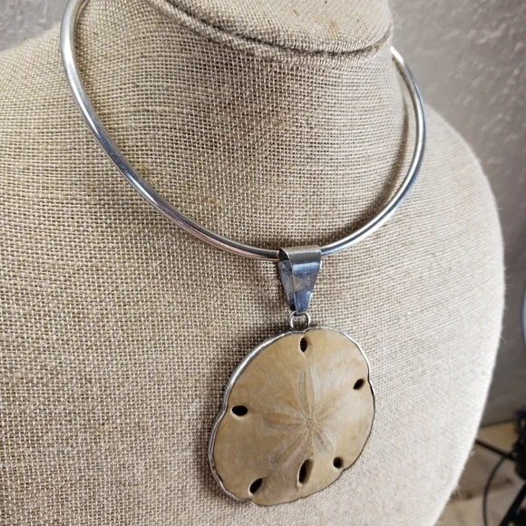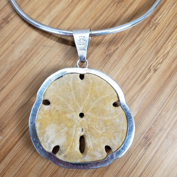Sterling Silver Choker Necklace with Fossilized Sand Dollar Pendant Signed Del Sol Jewelry.The tube choker necklace measures 13" long and has a 2 3/4" opening.The sand dollar...