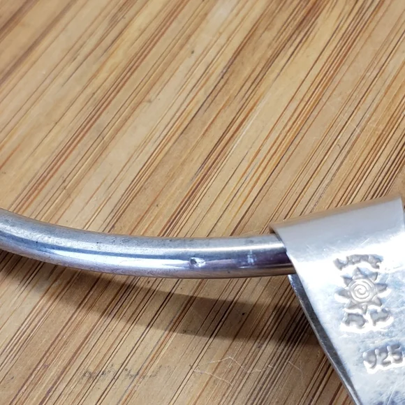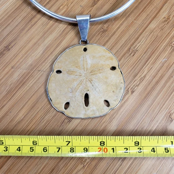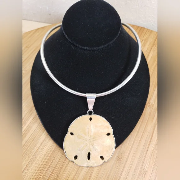 Sterling Silver Choker Necklace with Fossilized Sand Dollar Pendant Signed Del Sol Jewelry.The tube choker necklace measures 13" long and has a 2 3/4" opening.The sand dollar pendant measures 3 1/2" tall by 2 1/2" wide.It is signed Del Sol Jewelry 925.The tube choker has a small ding and light tarnish.Wow, what a standout!Wear this with your tan this summer!