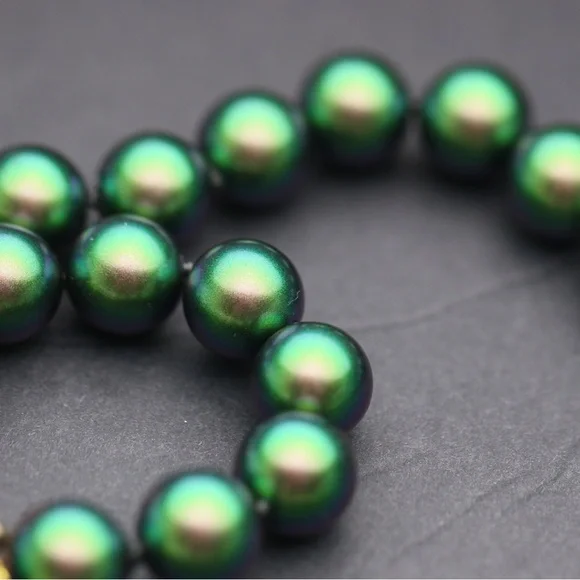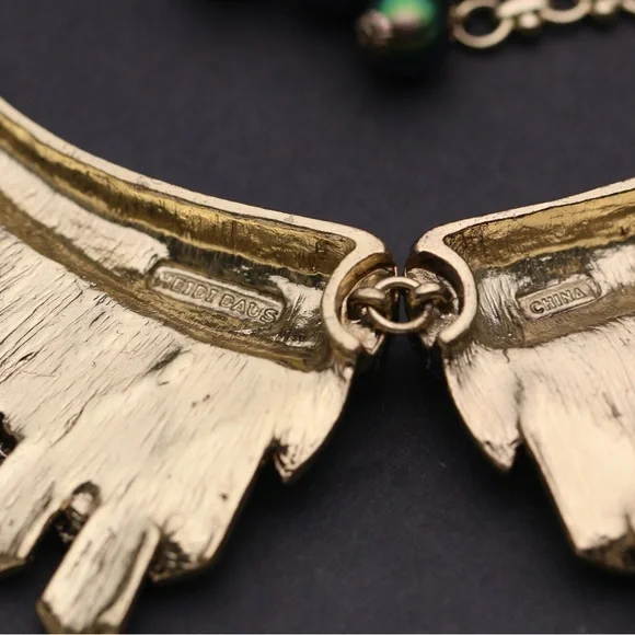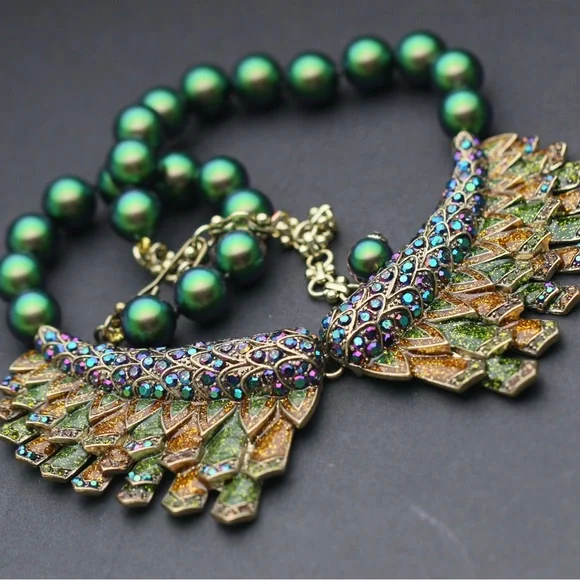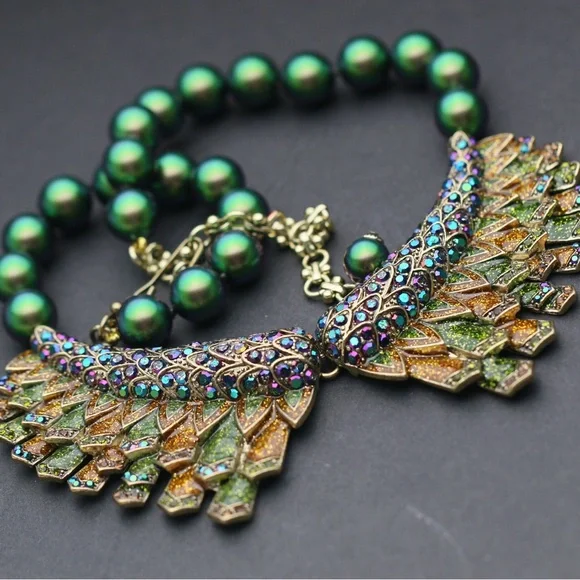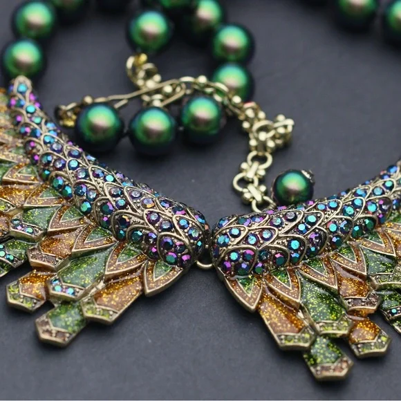 Don´t just wing it! Build your wardrobe around this showstopping design from Heidi Daus. The sparkling crystal wings and bold silhouette deserve to be the focal point of your ensemble.Design InformationSingle strand of individually knotted, scarabaeus green-colored, smooth glass beadsAngel wing-designed, collar-style dropTiered, green and brown glitter enamel-coated "feathers" and petite, pavé round crystalsOpen, serrated endsCrystal InformationThis piece contains smoked topaz-, olivine- and scarabaeus green-color crystalsNecklace DetailsNecklace Measurements: Approx. 16"L x 3/8"W with 3-1/2" extenderDrop Measurements: Approx. 3"L x 5-3/4"WMetal Color: Bronze-toneFindings: Hook closure; bead on end of extenderFinish: Oxidized, texturedBrand new without tag.