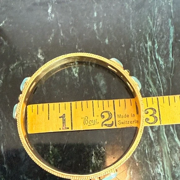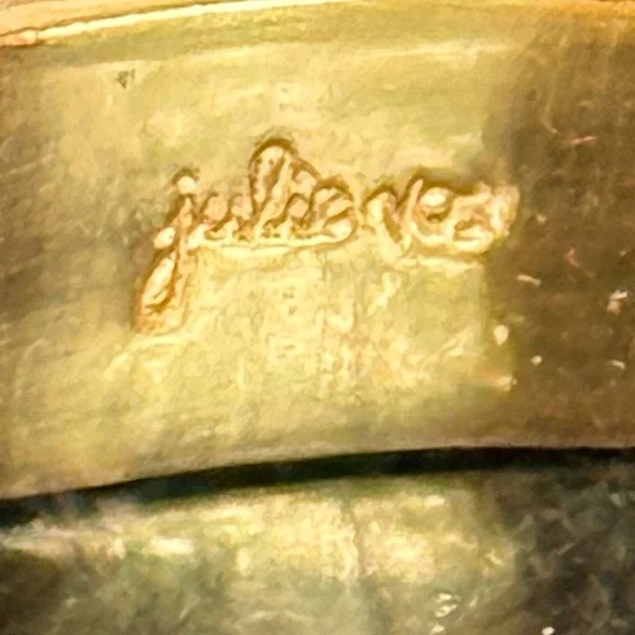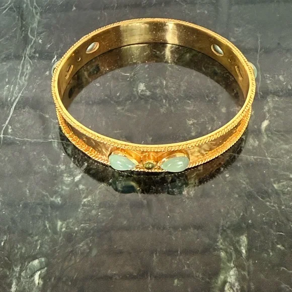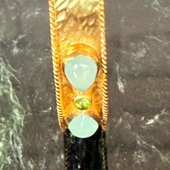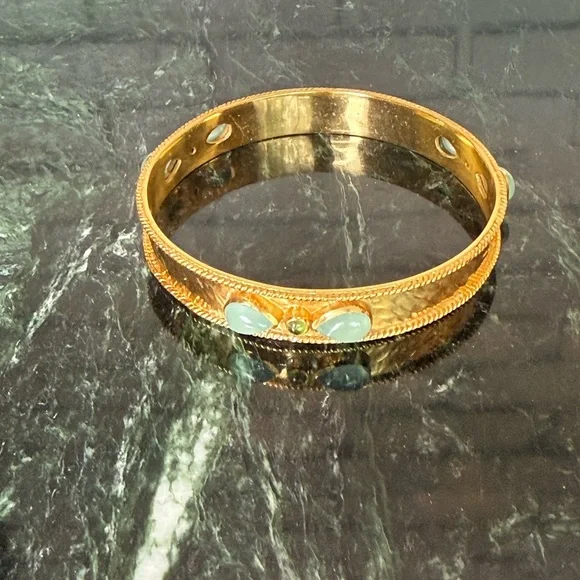 This stunning bracelet by Julie Vos features a luxurious gold finish with elegant green accents. The intricate floral detailing and hinged design make it a timeless addition to any jewelry collection. Perfect for adding a touch of sophistication to any ensemble.