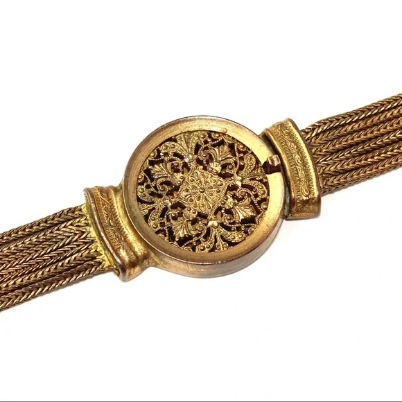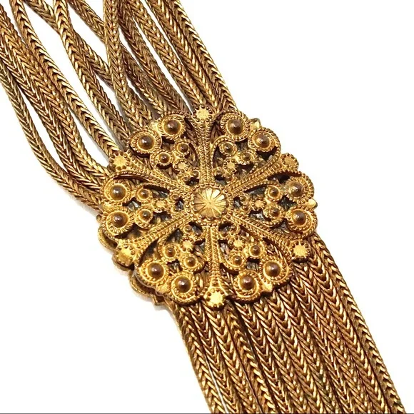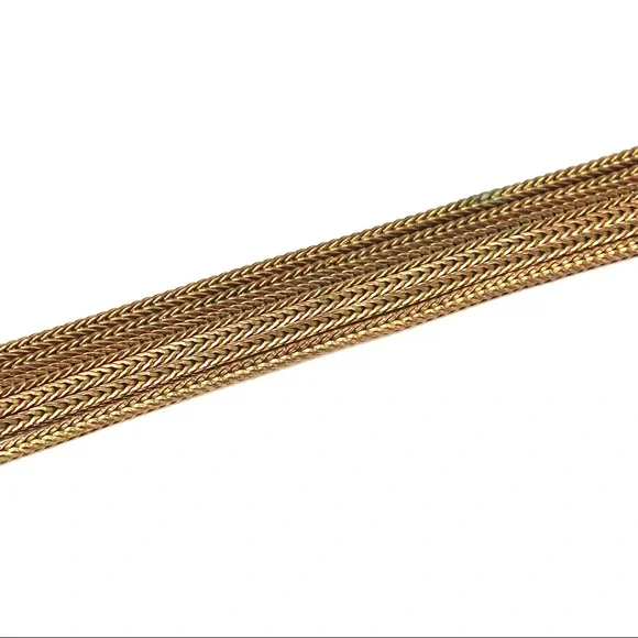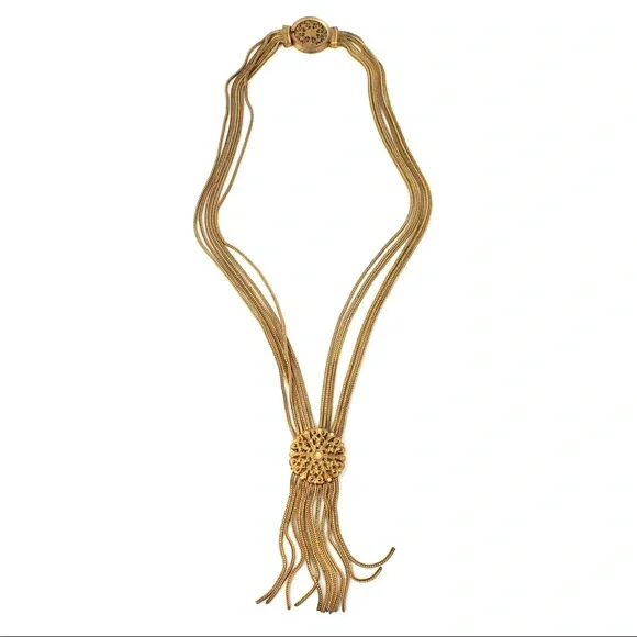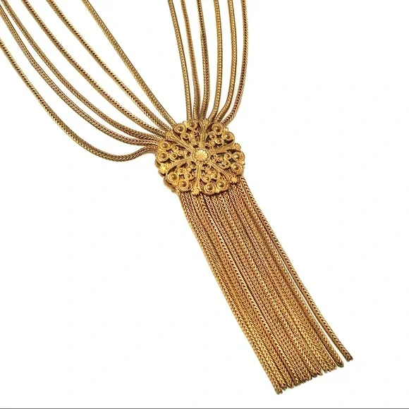 Antique Fishel, Nessler & Co. fringe tassel necklace. This gilt brass multi-strand necklace is constructed of long strips of foxtail chain. The chains fluidly drape the neckline and gather to a round focal centerpiece with an ornate filigree scroll design. This openwork style design is carried through to the decorative box clasp closure. Signed with “F.N. Co.” hallmark on back of clasp. 17.5” length with 2.6” pendant drop. Great vintage condition with significant darkening of gold tone throughout, but this wear is appropriate for gilt brass / Russian gold tone of this age.History: Fishel, Nessler & Co. was founded by Henry W. Fishel and Samuel C. Nessler around 1885 in New York City. By 1910, the company was located at Broadway and Crosby in New York. Most resources indicate that the company went out of business in the mid-1930s. The firm’s jewelry is rare and highly collectible.