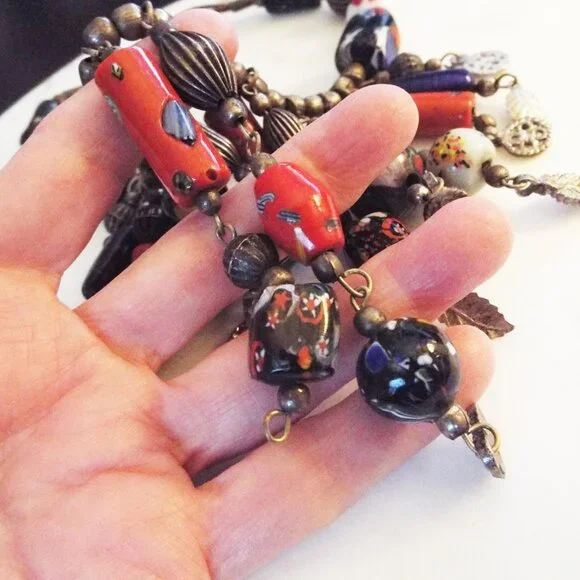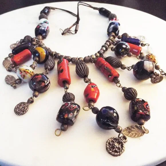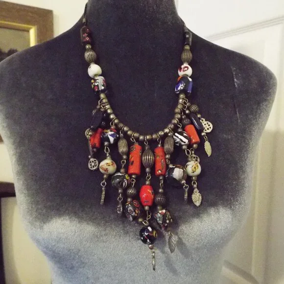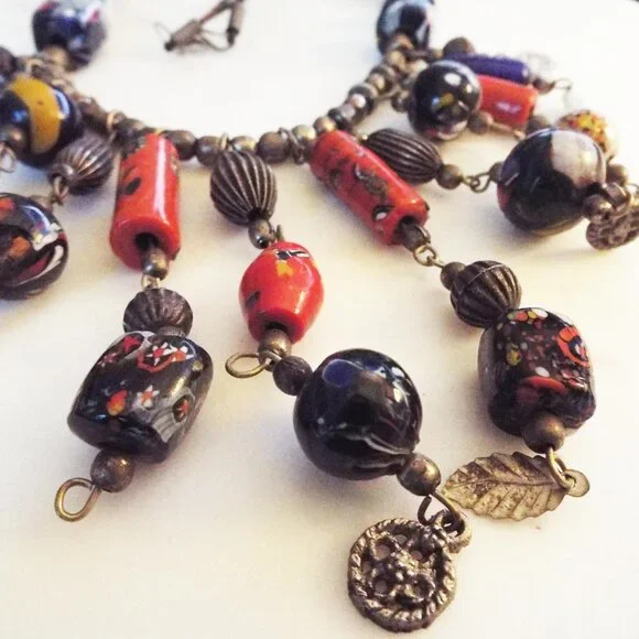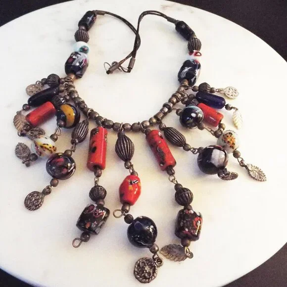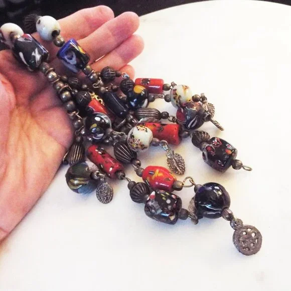ANTIQUE AFRICAN TRADE BEADS MULTICOLOR ARTGLASS FRINGE NECKLACE F