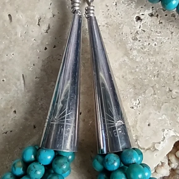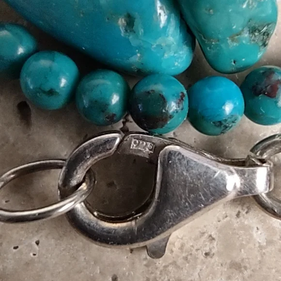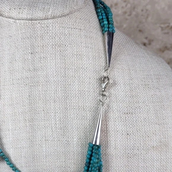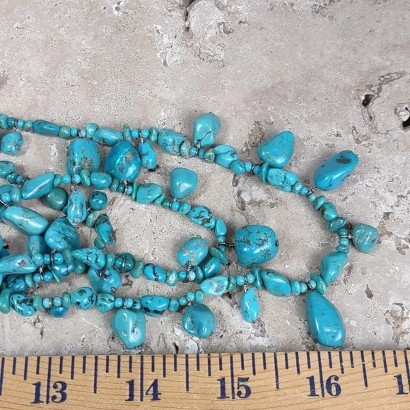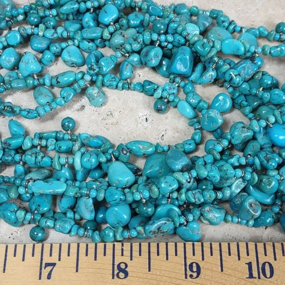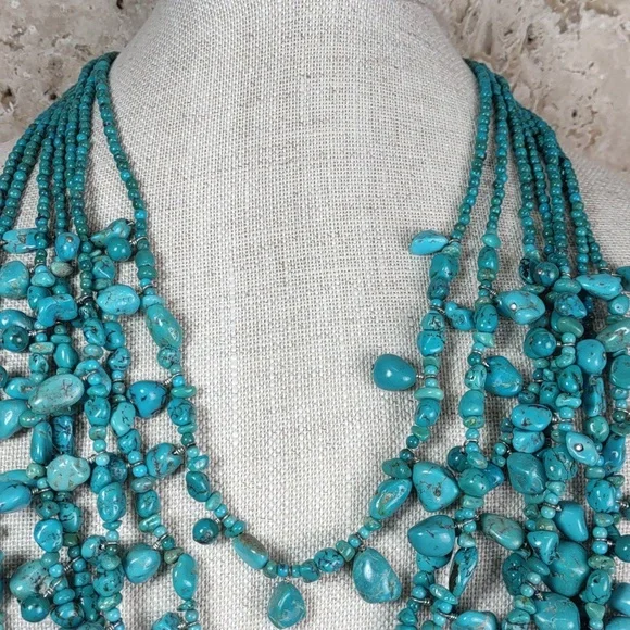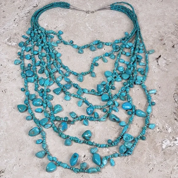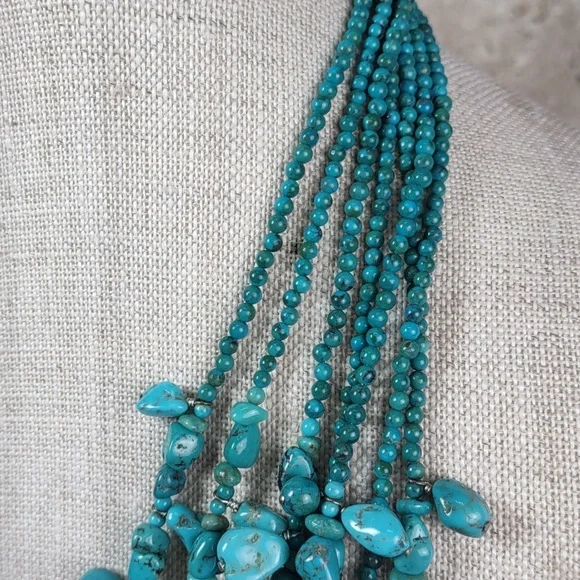 Artisan Crafted turquoise multi strand layered necklace.From the 2005 Tucson Gem Show.Fabulous layered turquoise necklace features 7 individual strands of multi textured nuggets in assorted shapes and sizes with larger turquoise droplets.Finished at the back of the neck with 3mm turquoise beads which makes this necklace very comfortable to wear.Drapes beautifully on the neckline.Strung on wire for flexibility and durability.Shortest strand measures approximately 18" length and the longest strand measures approximately 35" length.Sterling silver cone end caps with a lobster claw clasp are stamped STERLING 925Pre-owned, excellent condition.