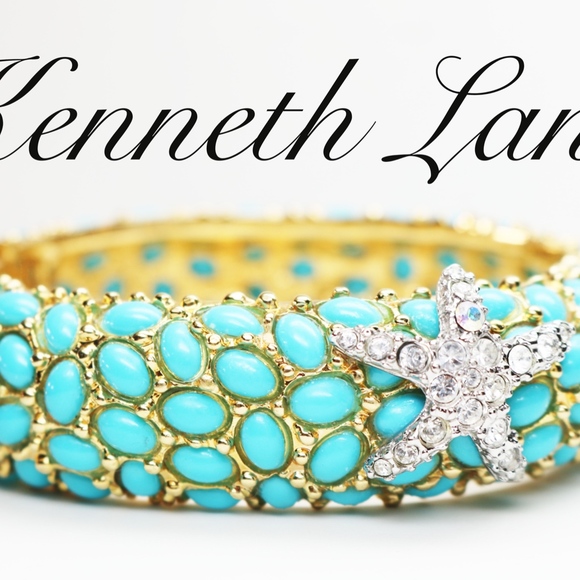 We present one of his most exquisite pieces with detailed prongs forming glimpses of glittering gold against Caribbean blue lacquered cabochons and finished off, like a piece of art, with a bright, dazzling pave crystals encrusted in a silver starfish. This piece is signed KJL, measures 7"L x 7/8"W, weighs 2.1 oz. and has a spring hinge clasp. This bracelet is in excellent vintage condition and would make a beautiful gift for collectors.#HamptonJewelry #KennethLane