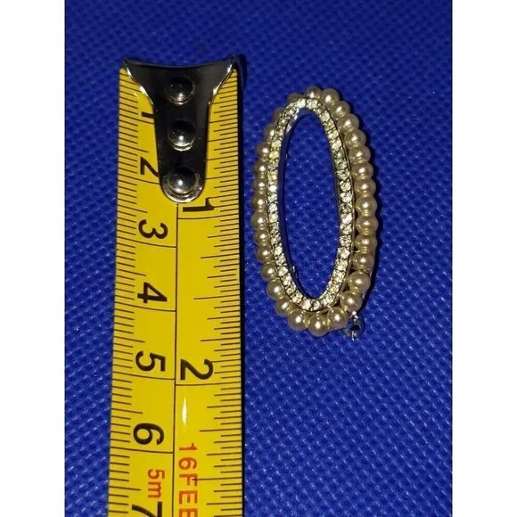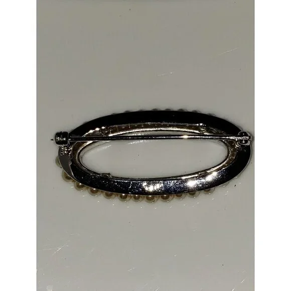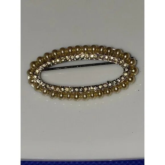 This stunning vintage Trifari brooch pin features a beautiful oval cream-colored pearl as the main stone, surrounded by round glass stones in a silver setting. It is marked and...