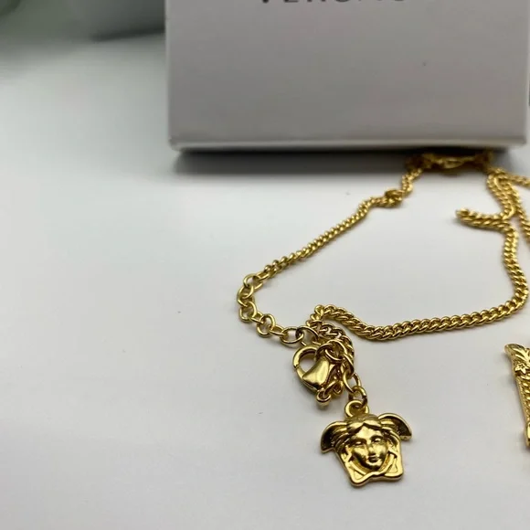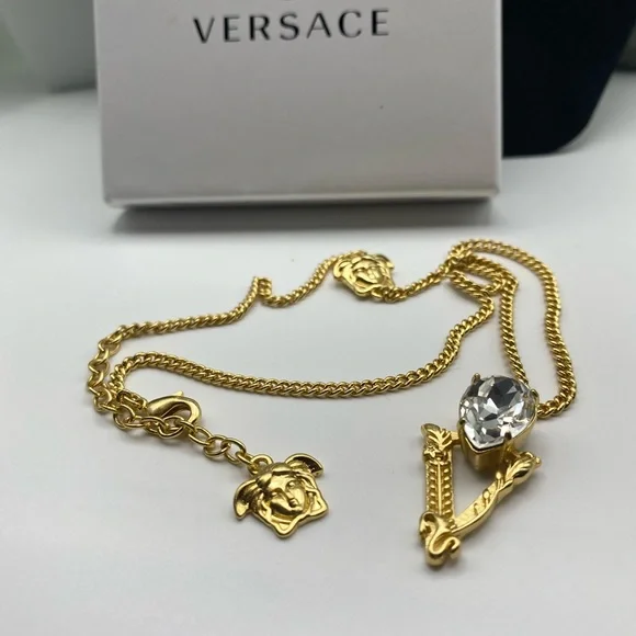 Chic Versace necklace in gold. Features a clear crystal accent. Adds elegance to any look.
