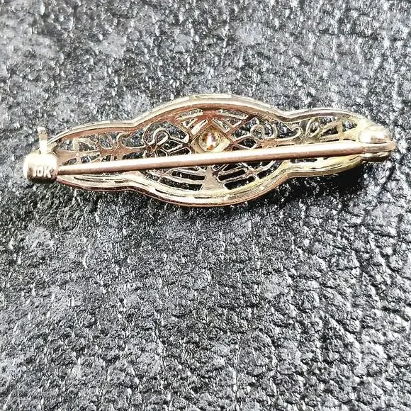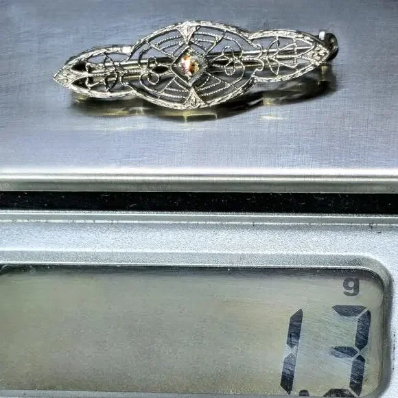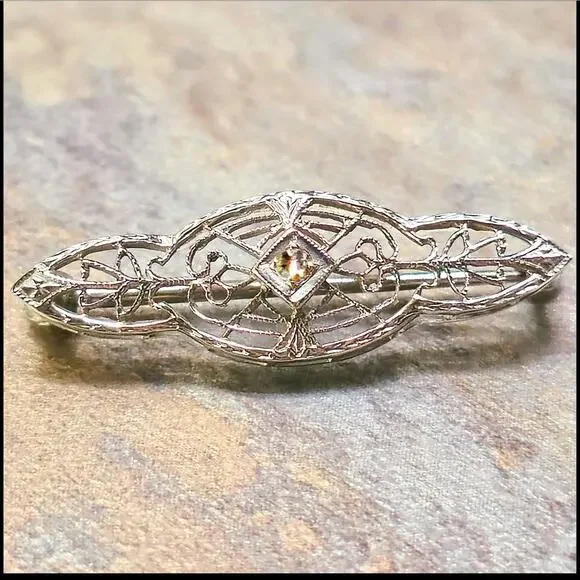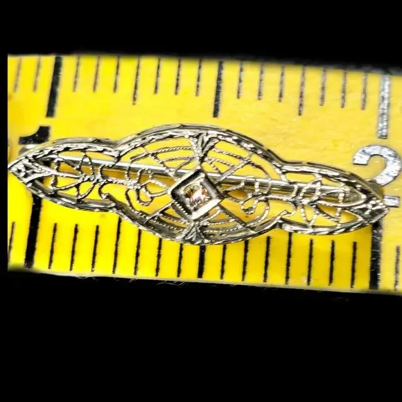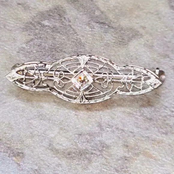 Antique Eduardian TESTED 10k White Gold Filigree Diamond Brooch. - Antique- 1 Inch Long - 10k White Gold - Diamond Vintage Pre-Owned ConditionNOTE:All photos are of the actual listing being shown, just be aware that due to differences in screen settings; using an assortment of different lighting, and the multiple camera angles that some colors may appear slightly different in person than on a screen or monitor.Item has been previously owned and well loved, so please closely inspect all photos to ensure you´ll be satisfied should you choose to make a purchase.Feel free to message me here on the platform for more photos or to answer any questions you may have. I am happy to negotiate with reasonable offers.