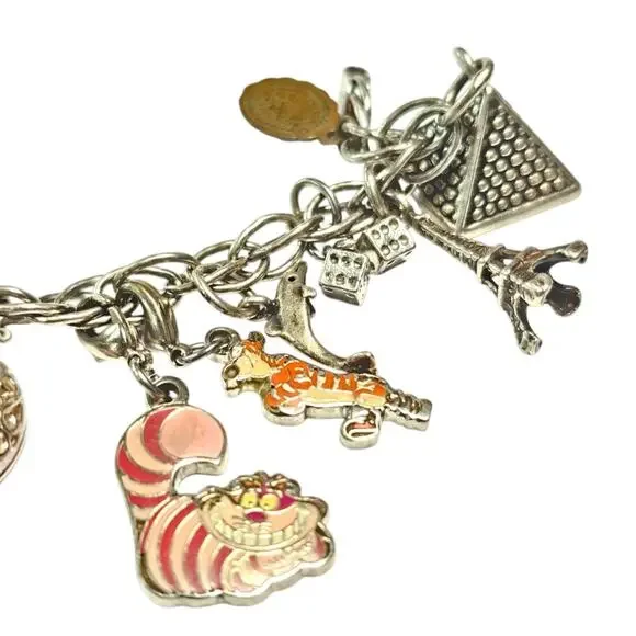 Vintage Sterling Silver Traveler´s Charm Bracelet, 7.5", 17 Sterling CharmsThis vintage charm bracelet, measuring 7.5 inches long, tells a story of travel with its collection of 17 sterling silver charms. Among the highlights are a cameo locket, a Merlion (symbol of Singapore), and a pyramid (likely representing Egypt). A particularly charming piece is the Spaniard flamenco dancer.The charms represent various destinations, including Egypt, France (Eiffel Tower), Spain (flamenco dancer), and Monterey, California (seal). The longest charm measures approximately 1 1/4 inches. Please note that two enamel Disney charms, a brass Virgin Mary charm, and a faux pearl charm are not sterling silver and are part of the total of 20 charms. This bracelet is a unique memento of past adventures.