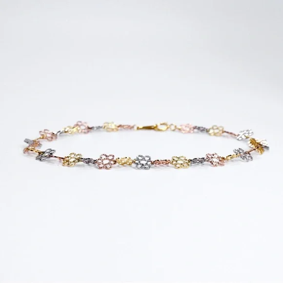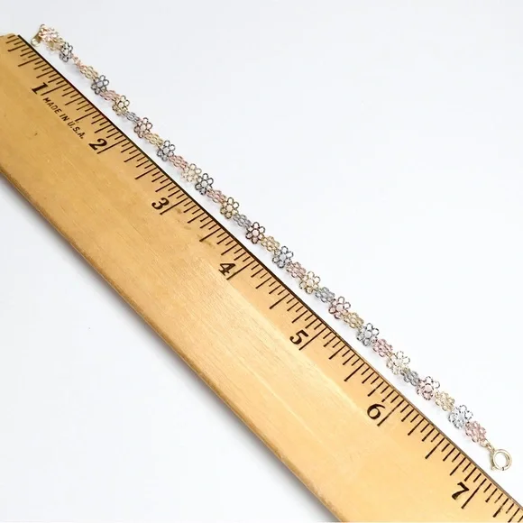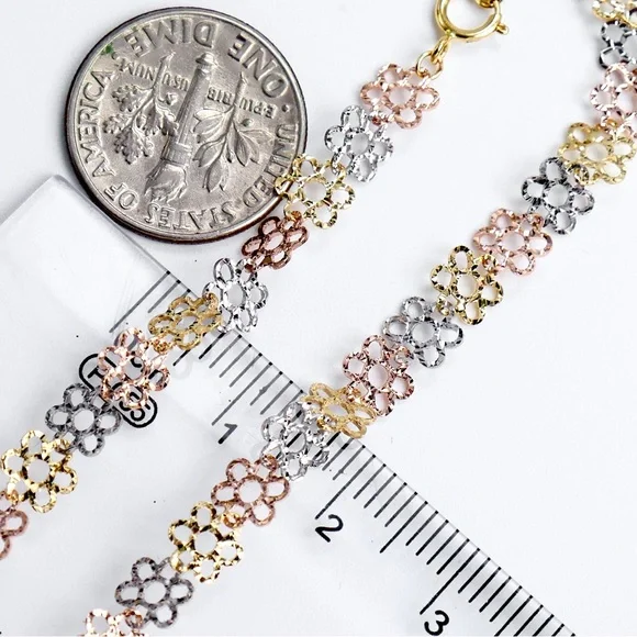 Beautiful flower link tri color bracelet.The bracelet is 7.25 inches long by 5mm wide.Spring ring clasp closure. It is solid 14K yellow, white, and rose gold.Weighs 2 grams.Brand new, great gift.