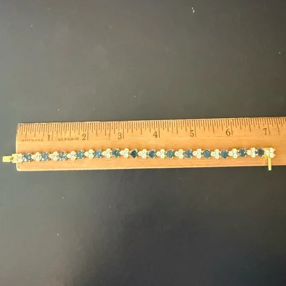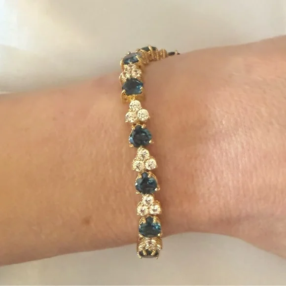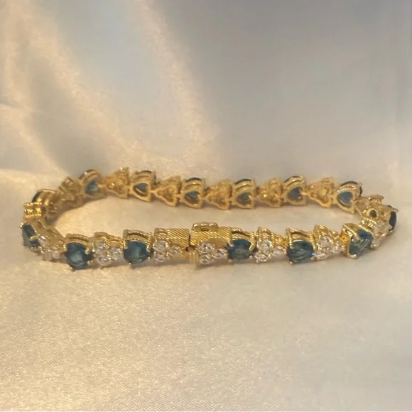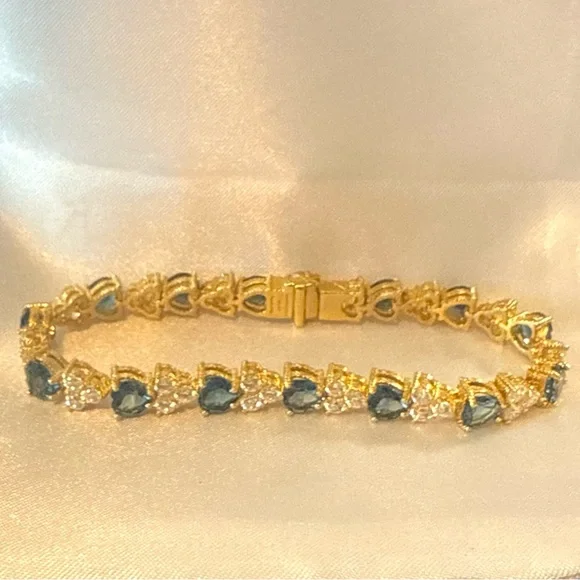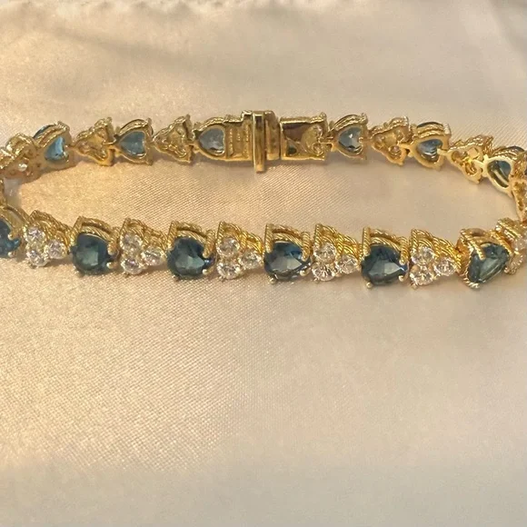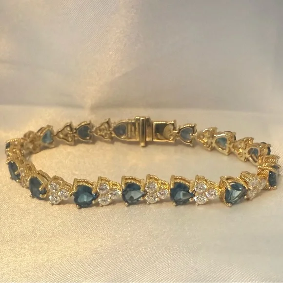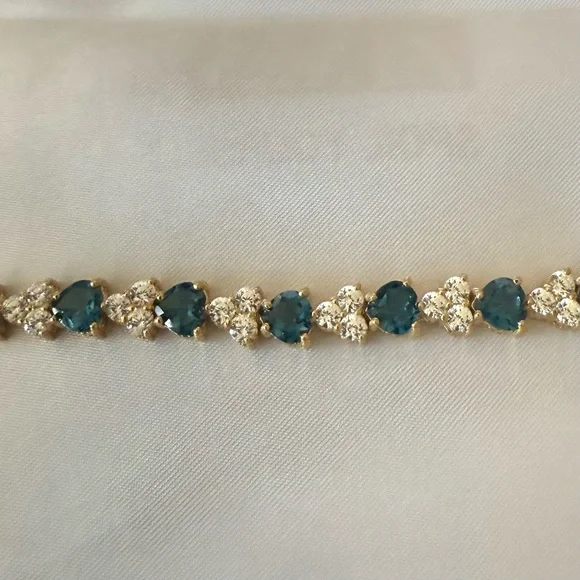 Judith Ripka London Blue Topaz Heart and CZ Sterling SilverTennis Bracelet, 7”* 14K Gold Clad over Sterling silver (925)* Total London blue topaz weight is approximately 11.00 carats* Total Diamonique (cubic zirconia) simulated diamond weight is approximately 4.80 carats* Prong-set, heart-shaped London blue topaz alternate with prong-set, round, 118-facet Diamonique simulated diamonds clustered together (cherries)* Hidden box and tongue clasp with safety catch* Measures approx 7" long.See images for details.
