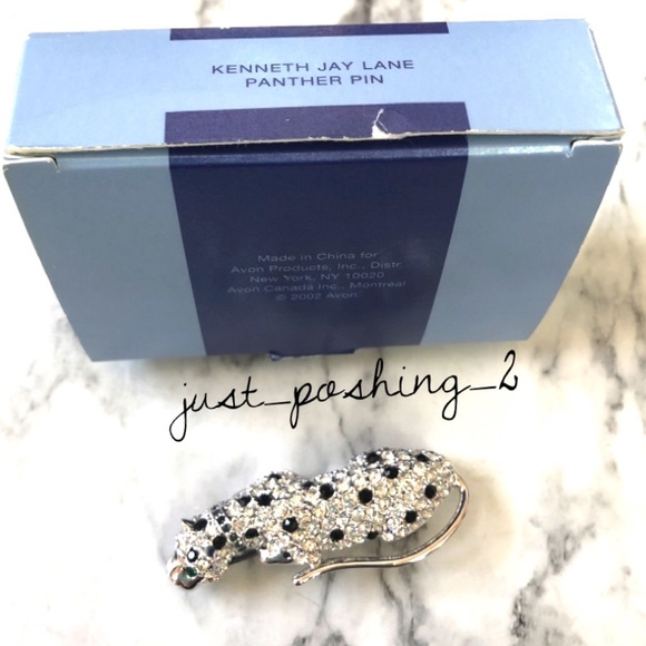 Kenneth Jay Lane Panther Pin and Clutch Black Satin Clutch with silver dot pattern. Clutch has a black cord strap that can be used or hidden inside. Interior slip pocketIt is adorned with a rhinestone embellished panther head door knocker kiss lock clasp mechanism with green, black and clear colored rhinestones.Measures approx. 6.75” x 4” x 1.75”Pin has Emerald green rhinestone eyes and blue collarMeasures 2 3/8" long X 1" widePin marked KJL For Avon Both used once box shows wear