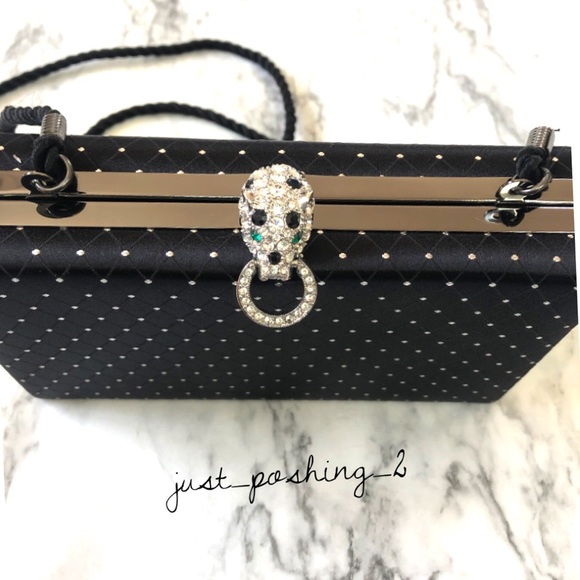 Kenneth Jay Lane Panther Pin and Clutch Black Satin Clutch with silver dot pattern. Clutch has a black cord strap that can be used or hidden inside. Interior slip pocketIt is...