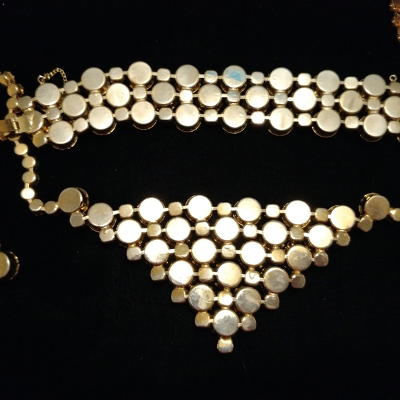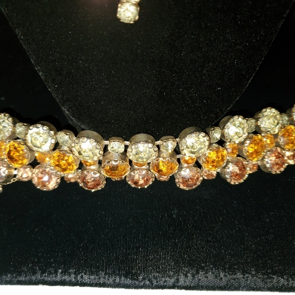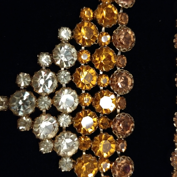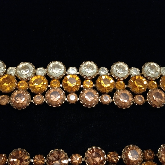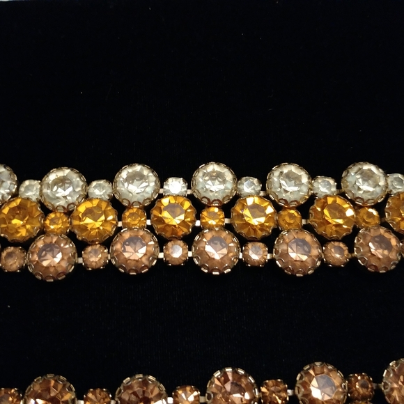 From the 1950´s or 60´s.All consist of brown, gold and pale yellow rhinestones in two sizes, all prong set. The 18 in. necklace is triangular and ombre in tone from...