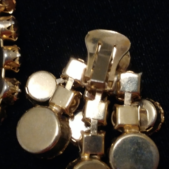 From the 1950´s or 60´s.All consist of brown, gold and pale yellow rhinestones in two sizes, all prong set. The 18 in. necklace is triangular and ombre in tone from yellow on the bottom to brown on the top. The 7 1/4 in. by 1 1/4 in. bracelet is quite fluid in movement. The clip earrings dangle 1 3/4 long and 1 1/4 in. wide.The V of the necklace is 2 1/2 in. in height. Single hook on the necklace, push clasp and safety chain on the bracelet and the clips are tight on the earrings