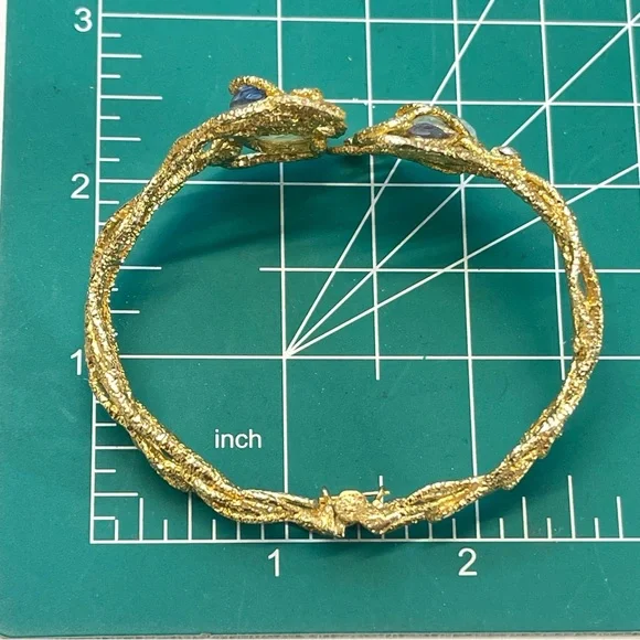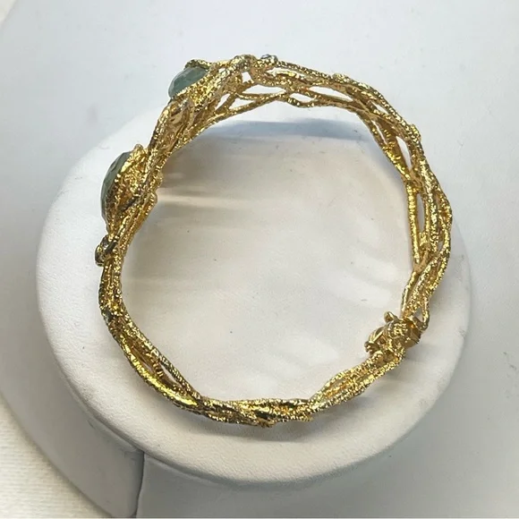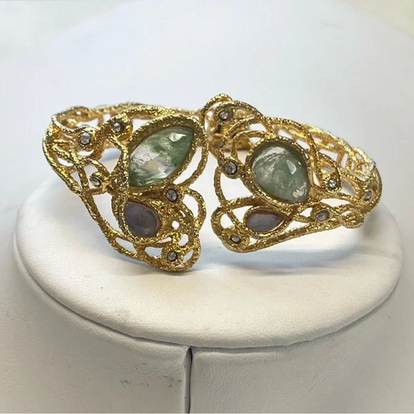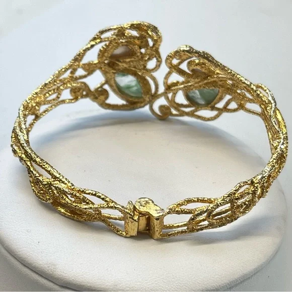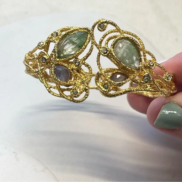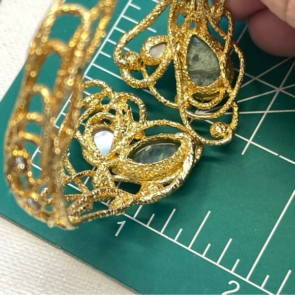 -Good used condition, very little gold plating loss near hinge, please see photos for condition and measurements-Gorgeous semiprecious gemstones, moss agate and possibly mother of pearl, with Swarovski crystal rhinestones adorn this organic, lacy filigree cuff, gold plated. Hinged closure.-STUNNING piece!