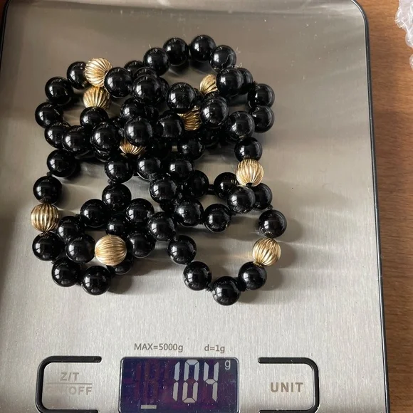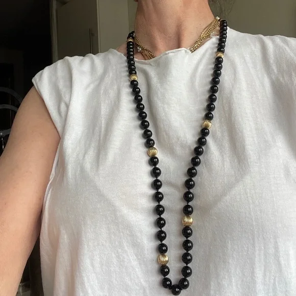 Vintage Estate 14K Yellow Gold Fluted & Black Onyx Bead Necklace 36".weight 104g,9 gold beads,72 onyx beads in pristine condition