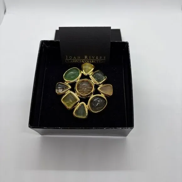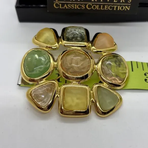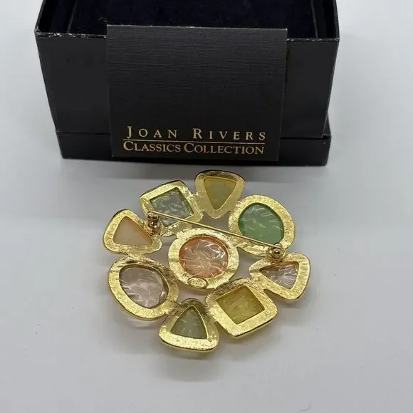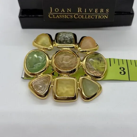 The Joan Rivers Gripoix Style Gold Tone Pastel Jelly Maltese Cross Brooch Pin is a stunning piece of vintage-inspired fashion jewelry. This original brooch features a unique cross shape design in multi-tone gold, with pastel jelly maltese cross stones adding a pop of color. Signed by Joan Rivers, this piece is perfect for adding a touch of elegance to any outfit.This is a good size brooch. Approximately 7.5 to 7.85 round.