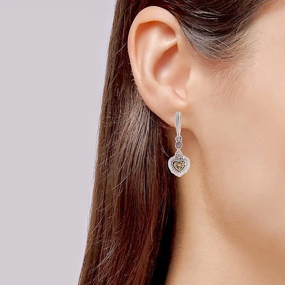 Beautiful Sterling Silver & 18K Gold Diamond Heart-shaped Drop EarringsRound, brilliant cut Diamonds total 0.06 caratsRhodium-plated 925 Sterling Silver; ribbed textured detail18K...