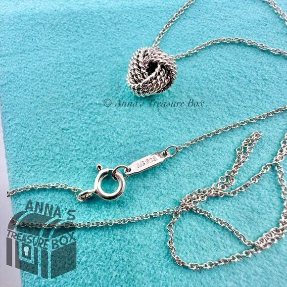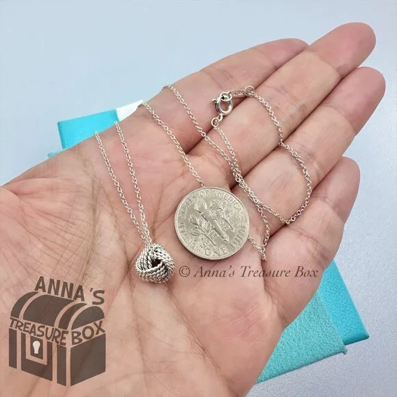 Pre-owned.In pristine condition.Kept in Tiffany blue pouch, ready for gifting.This is an authentic Tiffany & Co. 925 silver somerset mesh knot necklace.Necklace length is 16".Knot size is approximately 10mm.Dime for size comparison.Please see all photos on this cute piece.Comes with Tiffany blue pouch.If you have any questions, please ask :)