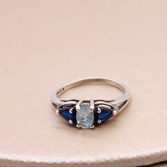 EUC Sterling Silver Ice Aquamarine & London-Blue Topaz RingSize: 6.75Details:925 Sterling Silver1 Oval Cut Ice Aquamarine Gemstone2 London-Blue Topaz GemstonesProng SettingWeight: 2.1gStampedCondition: Excellent used condition. Some surface wear as photographed. Have this ring professional cleaned & polishing, & it will look like new! See images & video for overall condition.** tagged for exposure**