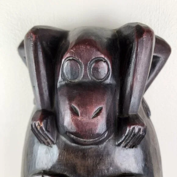Cool Hummingbird Imports Indonesia wooden carved mask with monkey on top.Size is 18" tall.Two small light chips (shown).Could be filled and painted.Reddish dark brown in color.String for hanging.Thanks for shopping with us!