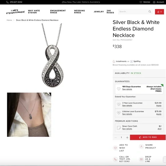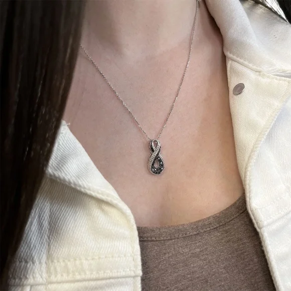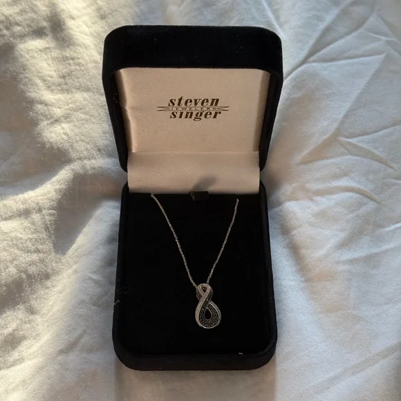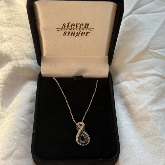 This high-quality necklace features genuine white and black diamonds in a sleek infinity design. Originally purchased from I Hate Steven Singer for $338, this piece has never been worn and comes in its original packaging—ready to gift or keep.• 1/3 Carat Black & White Diamonds• Clarity: I• Sterling Silver Chain• Height of Infinity Sign: 1.25"• Adjustable Chain: 16–22"• Condition: Brand New, in Original PackagingPurchase from here for the same necklace on Steven´s website with a discount!