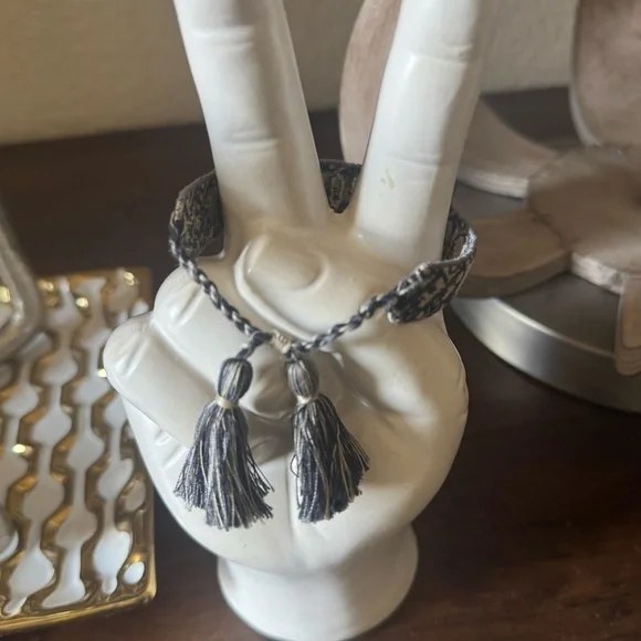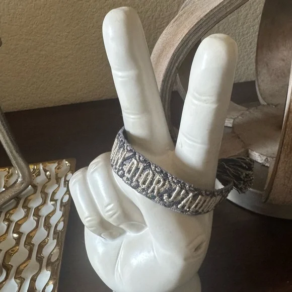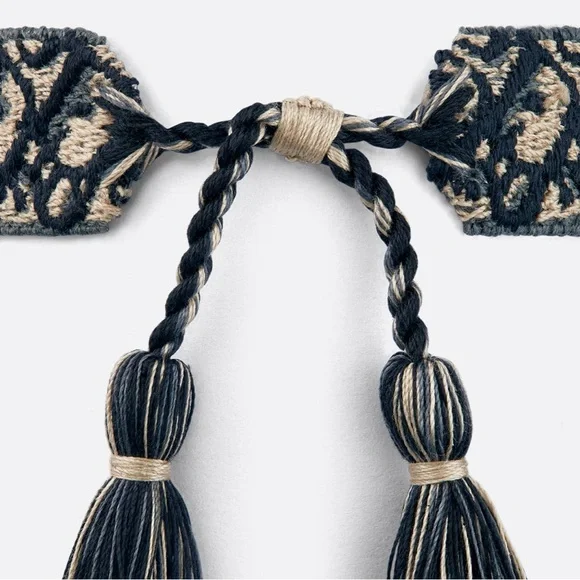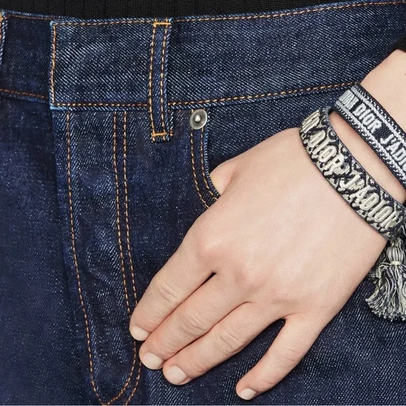 This bracelet is new without tags. Never used. Has been stored in my jewelry drawer. The Christian Dior signature adorns navy blue cotton, paying tribute to the iconic Dior Oblique motif. The bracelet is adjustable with handmade tassel cords, and can be worn for any occasion, alone or stacked.• Embroidered Christian Dior signature on the front• Navy blue Dior Oblique motif• Slide fastening with tassels• Made in Italy