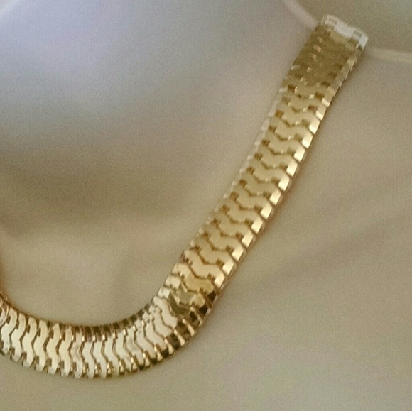 Beautifully design gold tone herringbone Style fashion wide necklace. It is a must-have. It will be fabulous for work Church School fun night out with friends.