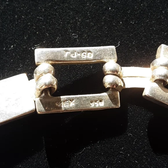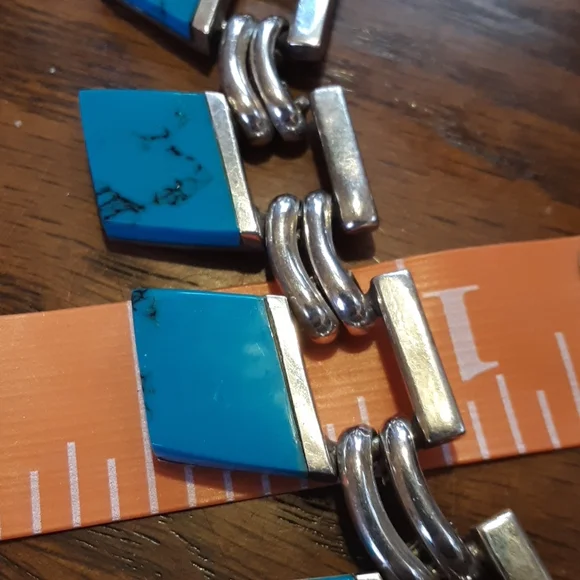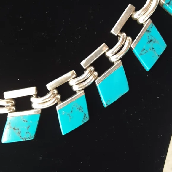 Sterling Silver Stamped .950 TJ 60 Mexico Turquoise Necklace measures 16 inches in length Too heavy for my scale This piece has not been cleaned