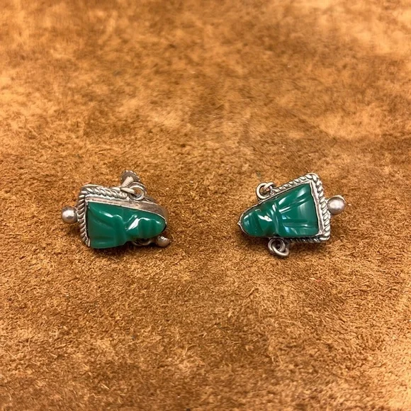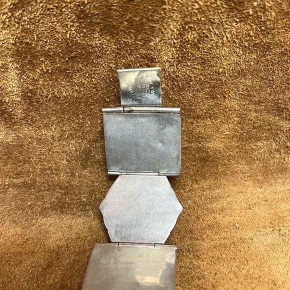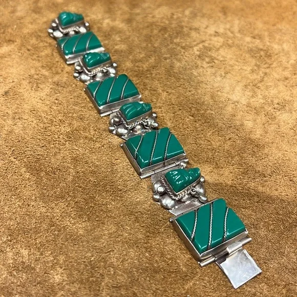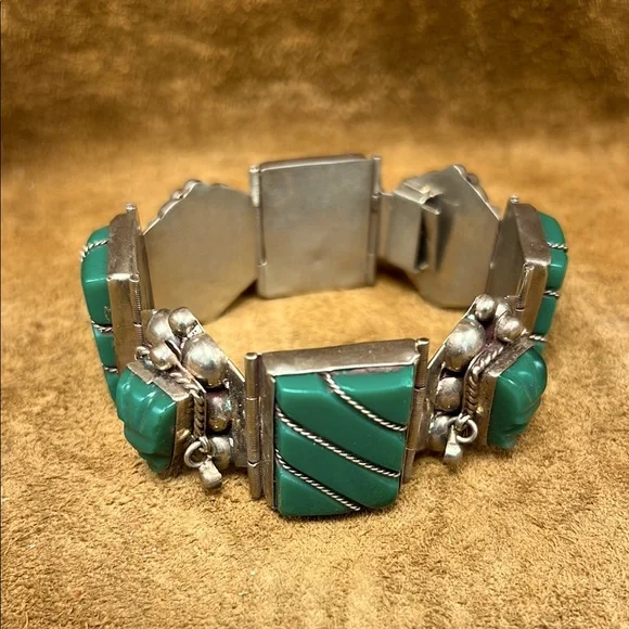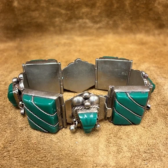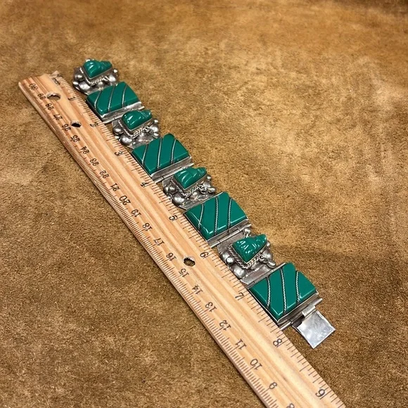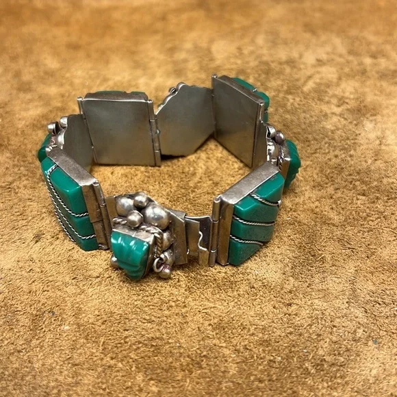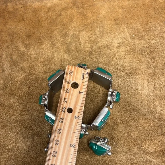 Beautiful and vintage best describes this glorious looking sterling silver jade bracelet with matching earrings included.This item is in overall good condition.Please view all photos prior to purchase.Please ask all questions prior to purchase.Thanks.