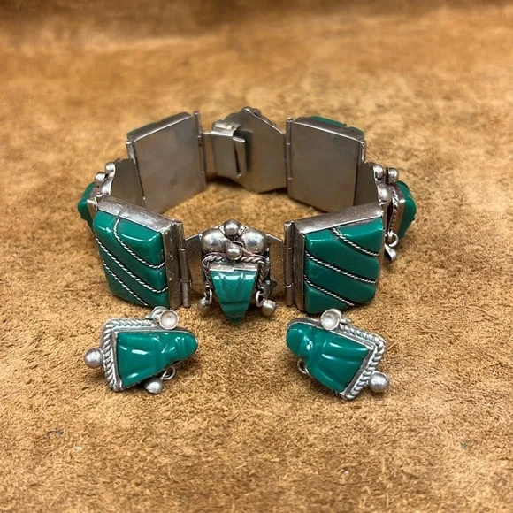 Vintage 1940s Sterling Silver Jade Bracelet And Earrings Set